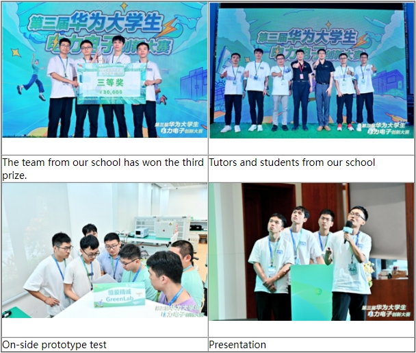 On August 24th, the final of the third "Huawei College Student Power Electronics Innovation Competition" was held at Huawei European Town in Dongguan. A team from our school, "Hengaijingcheng GreenLab," guided by Professor Qiang Chen, won the third prize (team members: Chenghao Bao, Sheng Su, Shixiao Yang, Shilong Wang, Ruiqi Yin). This is the first time our university has won an award in this competition.