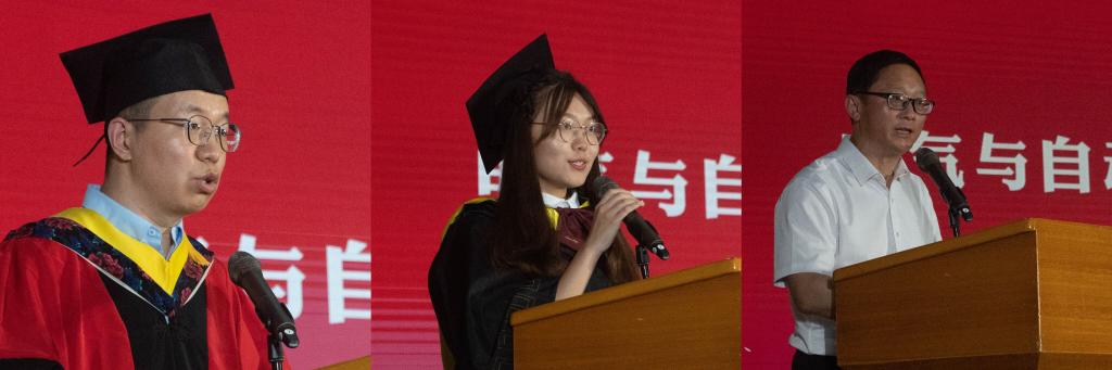 仪式上,李贺龙教授作为教师代表发言,向取得学位的2023届毕业生表示祝贺,他表示电气学院相关专业赶上了好时代。同学们要感恩时代赋予的使命,一方面要百舸争流,在专业实践中贡献自己的力量,同时也要珍惜自己能够处在朝阳行业当中,要不骄不躁,做好长期规划,持续学习,时刻保持竞争力。始终坚持不懈,心怀感恩,踏实收获精彩的人生旅程。校长奖获得者,电气工程及其自动化专业2019级3班刘丽娜同学作为毕业生代表发言,她深情感恩母校的培育培养,感恩老师的辛勤指导,号召广大毕业生牢记“厚德、笃学、崇实、尚新”校训,自觉以成长为“德才兼备、能力卓越,服务国家的骨干与领军人才”为目标,不负韶华,奋勇成为新时代前进的搏击者。毕业生宋月恒同学的父亲代表全体家长发言,他表示工大永恒,世界常新。感谢学校对孩子的精心培养和深情厚爱,祝愿学校事业蓬勃发展,老师桃李满天下,祝愿同学们鹏程万里,拥有灿烂辉煌的精彩人生。