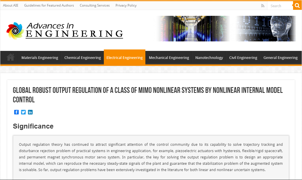 2021年12月,beat365官网平兆武教授课题组发表在控制领域著名期刊《International Journal of Robust and Nonlinear control》的研究论文被国际著名工程学科技机构“Advances In Engineering”(简称AIE)遴选为关键科学文章(a key scientific article),并以“Global robust output regulation of a class of MIMO nonlinear systems by nonlinear internal model control”为题在电气工程(Electrical Engineering)栏目进行专题报道。