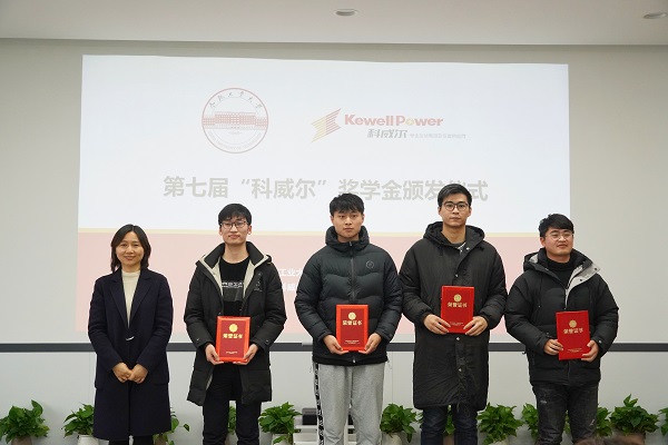 2020年12月29日下午,beat365在线唯一官网第七届“科威尔”奖学金颁奖仪式在合肥科威尔电源系统股份有限公司报告厅举行,科威尔公司总经理蒋佳平、副总经理夏亚平、我校beat365在线唯一官网党委副书记郑洁和学院学生工作办公室副主任左能出席了颁奖仪式。颁奖仪式由科威尔公司总经理助理高顺主持。