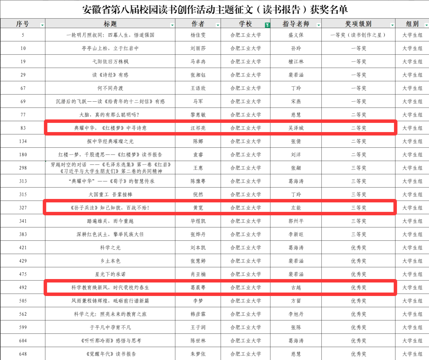 学院积极响应学校号召,深入推进书香社区建设,在安徽省第八届校园读书创作活动中精心选拔优秀作品参赛,涌现出多件彰显学科特色的获奖佳作。其中,《典耀中华,<红楼梦>中寻诗意》(作者:汪祁亮,指导老师:吴泽城)获主题征文(读书报告)二等奖,《<孙子兵法>知己知彼,百战不殆!》(作者:黄宽,指导老师:左能)获主题征文(读书报告)三等奖,《科学教育焕新风,时代茕枝灼春生》(作者:葛晨粤,指导老师:古越)获主题征文(读书报告)优秀奖荣誉。