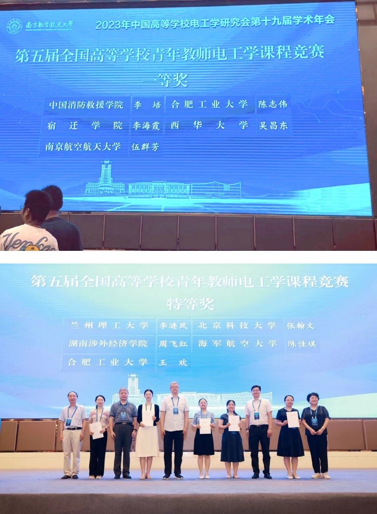 7月12-13日,第五届全国高等学校青年教师电工学课程教学竞赛在南京航空航天大学落下帷幕,本次比赛是由教育部电工电子基础课程教学指导委员会及中国高等学校电工学研究会联合主办,beat365在线唯一官网青年教师王欢老师与陈志伟老师经过安徽赛区选拔参加比赛,并分别荣获特等奖和一等奖。