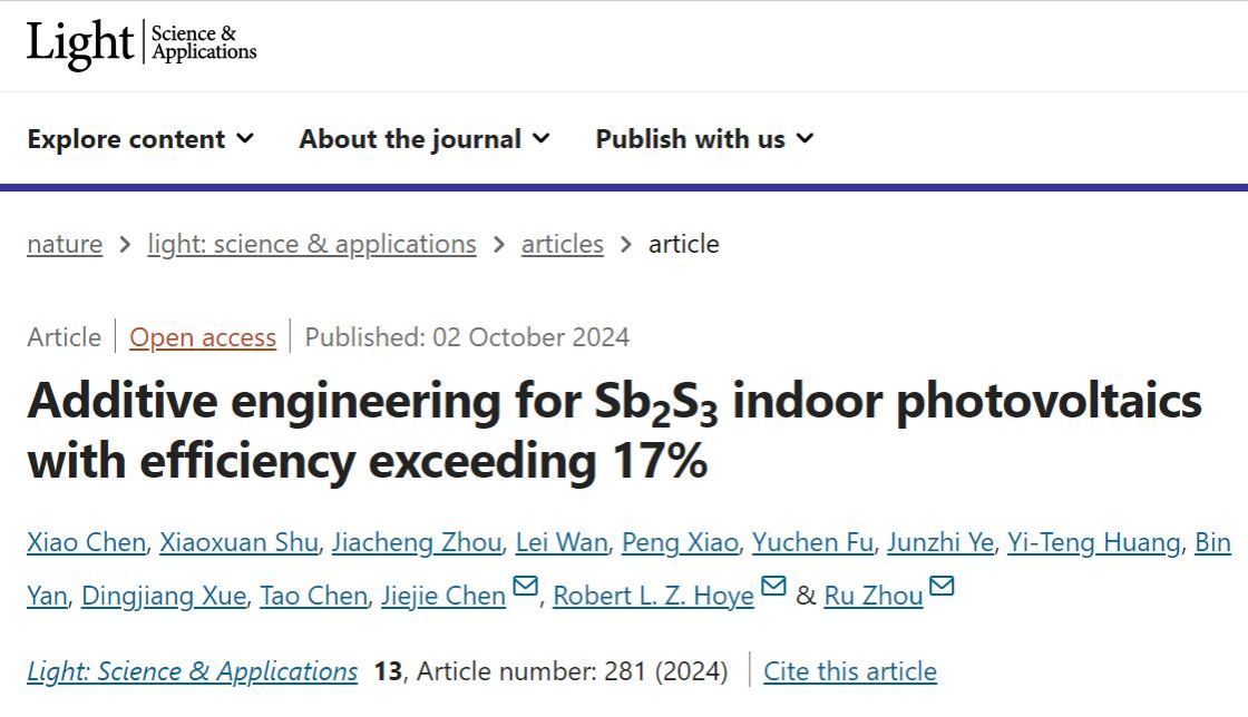 近日,我校beat365在线唯一官网周儒课题组在先进室内光伏技术领域取得最新进展,相关研究成果以“Additive engineering for Sb2S3indoor photovoltaics with efficiency exceeding 17%”为题在线发表于Nature合作期刊《Light: Science & Applications》,该刊为光学领域国际顶级学术期刊。
