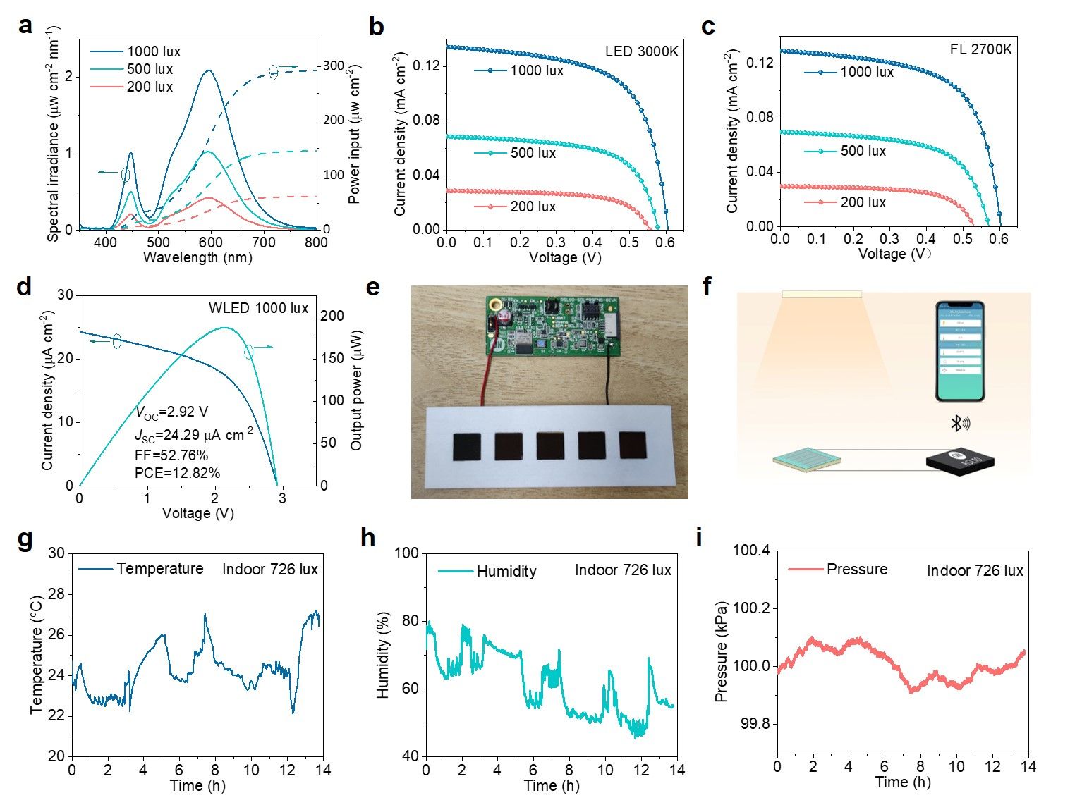 为此,周儒课题组与牛津大学、中国科学技术大学等单位合作,基于环境友好型硫化锑(Sb2S3)半导体材料开发高性能室内光伏器件,并成功实现面向自驱动物联网的低功耗传感器应用演示, 展示出Sb2S3光伏器件应用于室内环境能量收集的广阔前景。Sb2S3是一种储量丰富、低毒性、理化性质稳定的半导体材料,其带隙约为1.75 eV,十分接近室内光伏应用的最佳带隙值。研究团队基于添加剂工程策略有效改善Sb2S3薄膜质量,成功开发高效平面异质结Sb2S3薄膜太阳能电池,在一个太阳(AM1.5G,100 mW cm-2)光照下的光电转换效率为7.22%。同时,器件在低照度室内光照下表现出优异的室内光伏性能,在照度为1000 lux的WLED辐照下,器件效率达17.55%。与受到广泛研究的Ag-Bi-I、BiOI、空位有序钙钛矿等新兴室内光伏材料相比,该研究中Sb2S3太阳能电池超过17%的室内光伏效率是该领域的重要进展。进一步,研究团队首次将高效Sb2S3太阳能电池应用于自驱动物联网。通过子电池串联获得Sb2S3小型模组(5×1 cm2),在照度为1000 lux的WLED辐照下器件效率为12.82%,最大功率点输出功率为187.17 μW。与商用氢化非晶硅室内光伏产品相比,该Sb2S3小型模组在光电转换效率和输出功率方面都表现出竞争优势。在日常办公室WLED照明条件下,利用该模组将室内环境光能转换为电能,成功驱动低功耗物联网多传感器平台稳定工作。传感器通过低功耗蓝牙与手机通信,实现实时监测和收集环境数据。该工作不仅为进一步提升Sb2S3太阳能电池光伏性能给出有益参考,同时也为面向物联网应用的环境能量采集提供了有效解决方案,有望推动先进室内光伏技术快速发展。