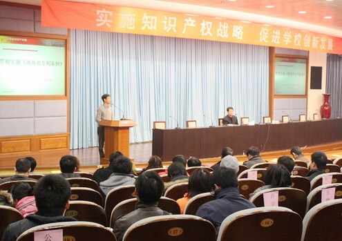 12月22日下午,《湖南省专利条例》(以下简称《条例》)宣讲会在科技大楼国际报告厅举行,湖南省知识产权局局长陈仲伯为我校师生解读了《条例》。副校长周科朝出席并主持宣讲会。