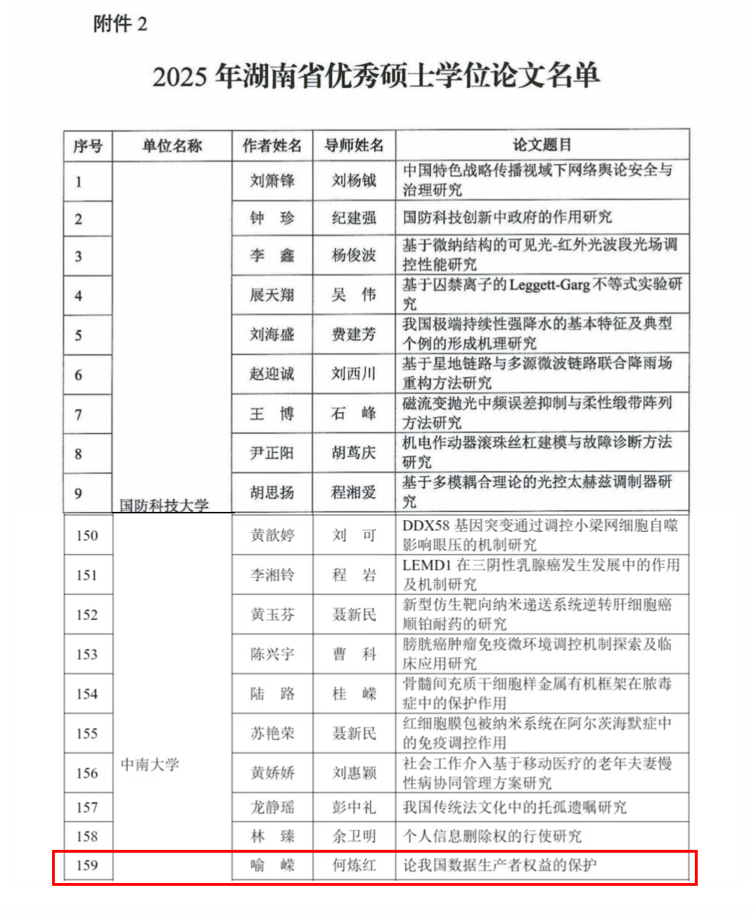 近日,湖南省教育厅公布2025年湖南省优秀硕士学位论文名单,BETVLCTOR伟德中文网站知识产权法学2020级硕士研究生喻嵘撰写的硕士学位论文《论我国数据生产者权益的保护》(指导老师:何炼红教授)获评2025年度“湖南省优秀硕士学位论文”。