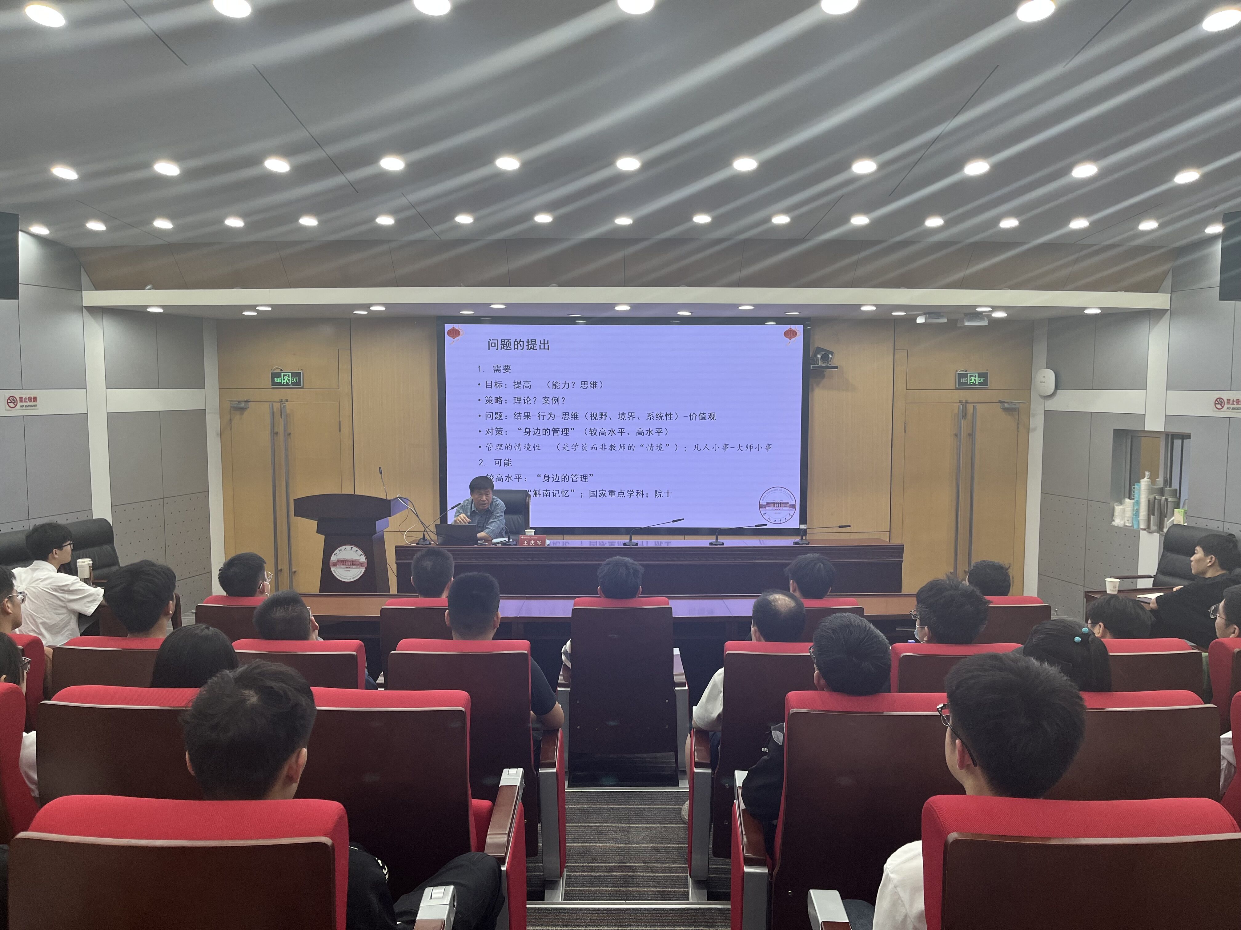 会上,王庆军老师以“斛南记忆”为主线,以“大人物的小故事”为佐证,以小见大,讲述管理学院的发展经历。在追忆往昔中抒发绵绵情意,在案例故事中渗透管理哲学,在谈论本质中体现科学方法,在畅谈梦想中寄托深切期望,在共话成长中展现学校风采,在漫谈价值观中承载着做人做事的道理。王老师表示,不要让自己因为现在优渥的生活条件而变得脆弱,要培养百折不挠的心理素质,承担起对个人、身边人、学校、社会、国家的责任。