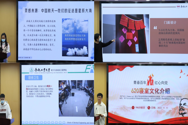 本次大赛共有180余间寝室参加,12间寝室入围决赛。从新青年海报到亮红色党旗,从中国精神的诠释到逐梦航天的理想,有的宿舍用红旗渲染浓浓爱国风,表达对祖国的热爱,宣告青春的誓言。艺术装点生活,生活品味艺术,有的宿舍以音乐治愈、用音乐温暖,在歌声中传递积极向上的态度,表现轻快明媚的艺术风趣。学思践悟,席典枕文,有的宿舍让简约融入生活,让学习成为共同追求。青春洋溢着活力的气息,有的宿舍用运动海报和体育器材书写运动乐章,在运动垫上鸣奏青春旋律。院学生办公室主任兼团委书记闫志伟点评总结,希望同学们“共融”生活习惯、价值观念和家庭背景不同造成的认知差异,“共创”美好环境、美丽回忆和美善文化,“共享”成长经验、进步故事和成长点滴,鼓励同学们通过寝室文化的渲染点亮内心世界,成就更好的自己。经评审,最终七号南楼115获得一等奖,九号楼620等2间寝室舍获二等奖,二号北楼118室等3间寝室获三等奖,二号北楼119等6间寝室获优秀奖。
