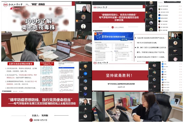 活动中,各支部指导老师通过对新冠知识及年度热词的普及,教育引导党员同志进一步认识到疫情防控形势的严峻性、复杂性;通过对合肥市相关防疫政策及疫情时报的分析,让大家认识到现阶段合肥疫情形势总体可控但仍不十分稳固;通过对学校疫情防控管制措施及警示案例的学习,进一步警示与会成员,应该严守学校防疫政策,发挥先锋模范作用。各党支部指导老师向全体学生发出倡议,作为党的先进分子应该做到“六个坚持”,一是坚持多通风、多打扫,遵守《寝室文明公约》,保持寝室卫生环境;二是坚持用心学、用劲学,按时参加线上教学,充分利用互联网搭建学习桥梁,自觉遵守教学规定;三是坚持不扎堆、不聚集,倡导出门佩戴口罩,杜绝外卖,减少网购;四是坚持每日检、每日报,恪守防疫规定,按要求测核酸、按规定健康打卡;五是坚持不信谣、不传谣,夯实信仰根基,增强网络道德意识;六是坚持多了解、多引导,提高国家抗疫时事关注度和疫情信息了解度,引导周边同学用知识武装自己,保护自我,用实际行动展现防疫战线上的青春之光。
