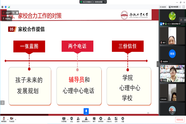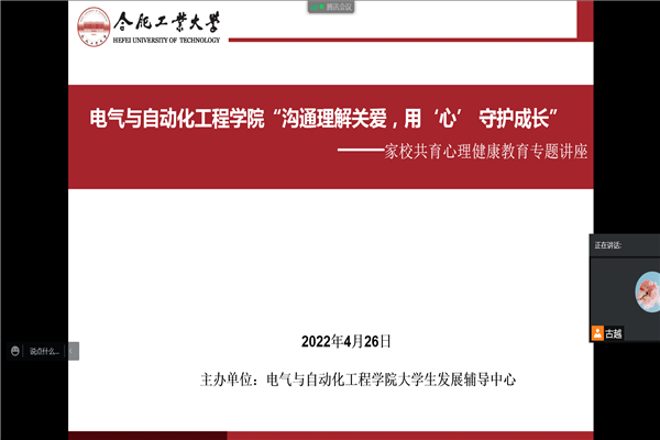 为向学生家长普及大学生心理健康知识,进一步发挥家校协同育人作用,4月26日晚,beat365在线唯一官网通过腾讯会议平台举办“沟通理解关爱,用‘心’守护成长”家校共育心理讲座。活动邀请学校心理健康教育与咨询中心骆贵老师主讲,2021级200余位学生家长参与活动。