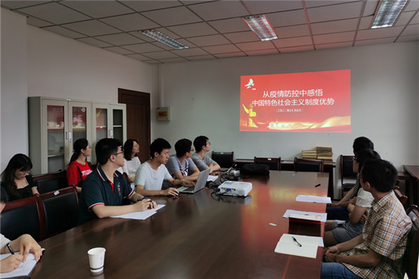 经前期讨论准备,全体党员就主题进行分组讨论汇报。韩屹首先以“中国特色社会主义的发展过程及内容”为主题,从“邓小平理论”,“三个代表重要思想”,“科学发展观”,“习近平新时代中国特色社会主义思想”这四个部分向大家详细讲述了中国特色社会主义的发展历程,让党员同志们感受到中国的发展亦伴随着中国特色社会主义的发展。之后,魏定生和乔一达同学结合自身经历,以他们对中国特色社会主义制度优势的感受为主题,结合当前时事,即抗击新冠疫情,从6个方面讲述了中国特色社会主义的优势。会中,支部书记马意超,以自身作为beat365在线唯一官网第20届研究生支教团去贵州支教一年的切身经历,通过比较支教前和支教后孩子们生活学习条件的切实变化,展示了党中央的脱贫攻坚工程的落实和对贫困地区孩子们的实质帮助。与会同学就几位同学的汇报发表了自己的看法,进行了积极的讨论。