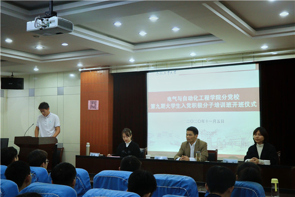 开班典礼由2020级辅导员、分党校班主任左能主持,会议开场后,全体起立并奏唱国歌;随后,党委副书记郑洁介绍了入党积极分子培训班的培训计划和相关要求,让学员们全面了解培训的内容、形式和重要纪律。接着,机器人工程19-1班肖幸飞同学代表全体入党积极分子,表达了争取早日加入党组织的决心和矢志不渝、努力奋斗的坚定信心。党委书记何岳颀在讲话中希望全体学员珍惜集中学习的机会,要求大家提高政治站位,增强“四个意识”、坚定“四个自信”、做到“两个维护”;加强理论修养,坚持读原著、学原文、悟原理;积极践行为人民服务的初心,从身边的小事做起,为学院文化建设、学风建设、班级建设服务,在实践中增长自身才干和能力。最后,开班仪式在庄严的国际歌中结束。