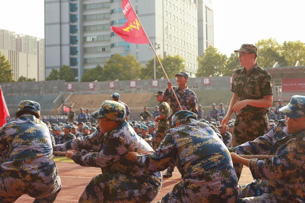 9月6日下午,军训团四营开展拔河主题实践活动。全体连队依照抽签分为“A~E”5个组别进行参赛,分出5强后一支队伍随机轮空,其余队伍依照4进3的赛制进行比拼,最后进行冠军冲刺。烈日炎炎下,燃烧的是青春学子的热情,鸣鸣哨声中,增强的是连队团结的配合,参赛选手摆足势、铆足劲,伴随着指导员和观赛学生的一声声“加油”共同向后发力,在呐喊中增进友谊,增强体魄,强化团结意识。