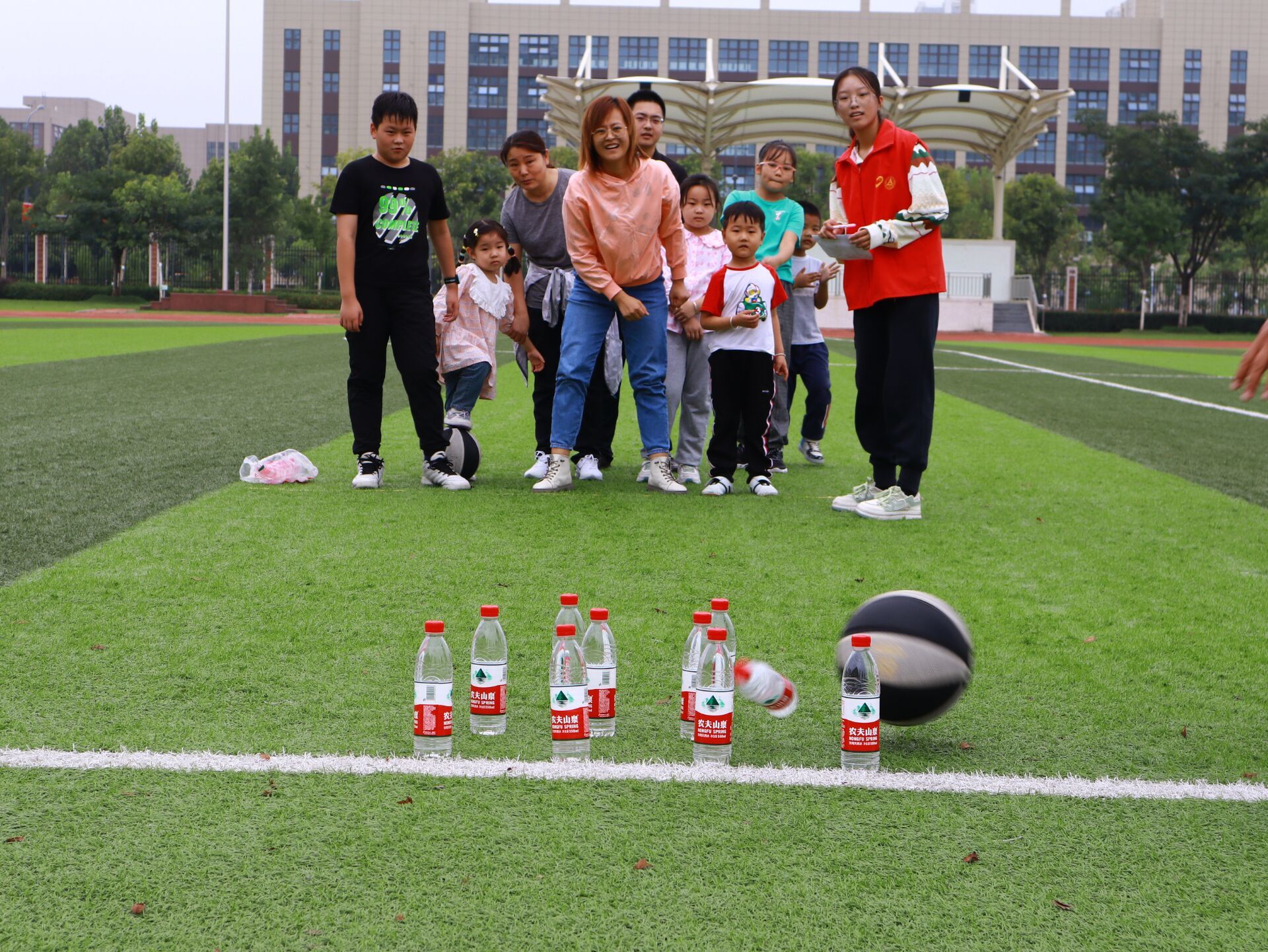 正式比赛分为健康知识答题、亲子障碍赛赛跑、两人三足、篮球保龄球和九宫格飞盘五个项目。健康知识问答环节每组家庭的小朋友向面前的海绵垫扔沙包,通过海绵垫背后字母抽取题目,题目由家长作答,志愿者负责打分并进行排名。亲子障碍赛环节小朋友和“大朋友”组队从起跑线出发,跨过由充气道具组成的障碍回到起点,志愿者在一旁计时,根据所用时间给出排名并确定每组得分。“两人三足”环节家长和小朋友将两条腿绑在一起,从起点跑到终点,用时最短获胜。篮球保龄球环节,志愿者将矿泉水瓶按顺序排列,小朋友和家长分别站在线后用篮球打倒矿泉水瓶,志愿者记录累计打倒瓶数,打倒数越多排名越高。九宫格飞盘环节小朋友和家长站在线内,分别投掷三次飞盘,扔出飞盘击中九宫格上的数字,即可加上该数字对应的得分,每个家庭按照投掷得分总和计算成绩。小朋友和家长们斗志昂扬、力争上游,比赛现场热闹非凡,在志愿者和工作人员的努力下活动圆满结束,工作人员为获胜的家庭发放奖品。
