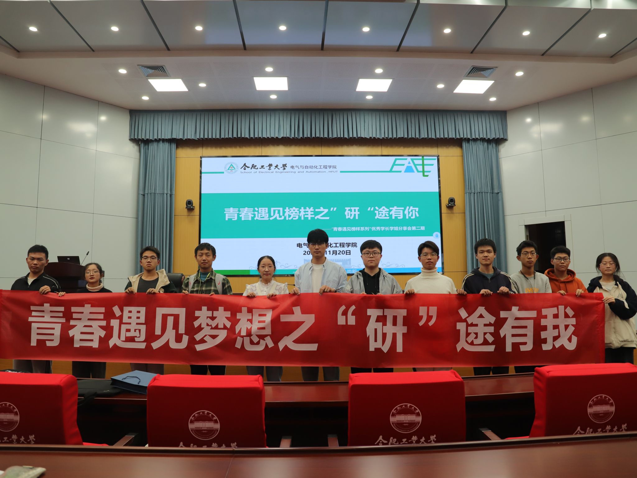 为激励学生树立学业目标,做好未来规划,助力成长成才,11月20日晚,beat365在线唯一官网在屯溪路校区学术会议中心一楼报告厅开展“青春遇见梦想”‘研’途有我交流分享会,邀请电气工程及其自动化专业、机器人工程专业、自动化专业3位2020级保研同学分享学习方法和保研策略,学院200余名学生参加活动。