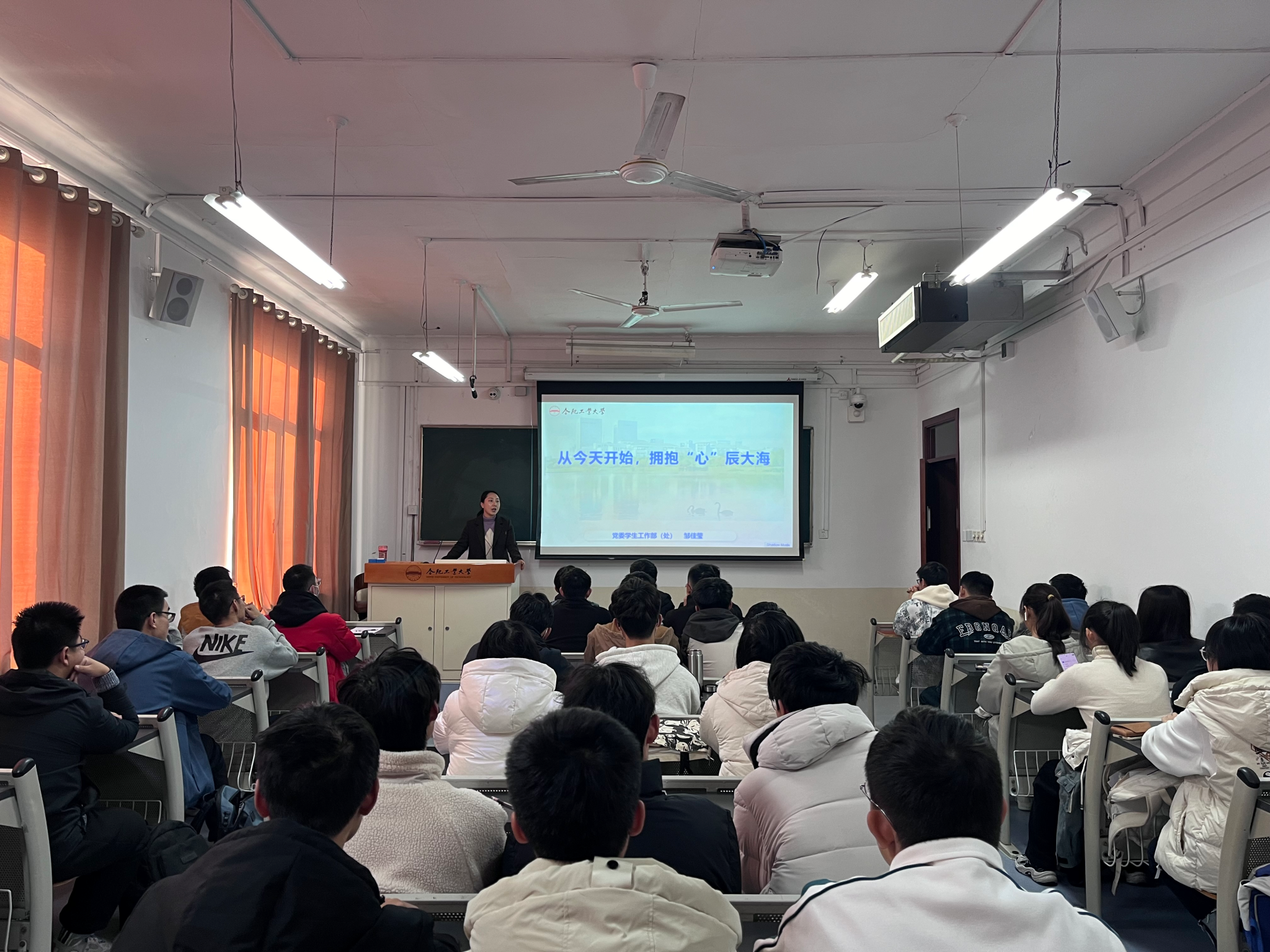 邹佳莹以《从今天起,拥抱“心”辰大海》为题,以拥抱带给人温暖的力量为引,提出一系列新生入校适应阶段可能存在的疑惑,带大家感受自己内心的变化。随后,邹佳莹从“我的大学期待”“我的心理变化”“我的大学规划”“我的支持资源”四个方面讲授了一堂暖心规划课。她表示,在清晰定位大学期待的基础上,要正确看待心理失衡、个体迷茫的变化,认识、发展、悦纳、成就自我,在生活中早做规划、精耕细作、积极调控、善待自己,给自己一定的时间去适应大学生活与以往生活的各种差异,积极做好各种信息的收集整合,为今后的生涯发展做好充足的准备。引导学生关注情绪,转变认知,找准优势,积极行动。讲座现场,她与同学们积极互动,解答学生心理发展困惑和现实生活困扰,课堂氛围轻松愉快。