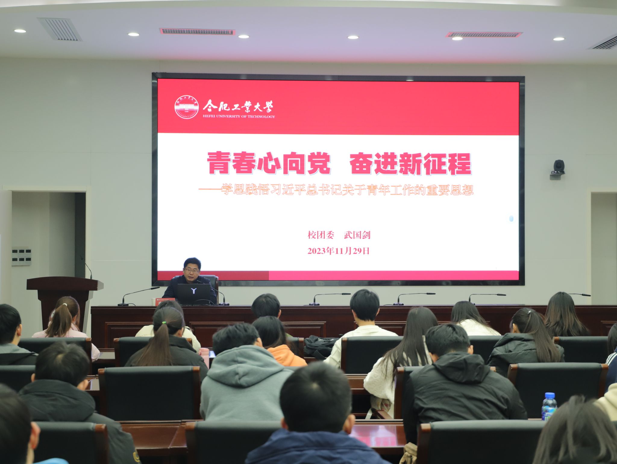12月1日晚,beat365在线唯一官网“青春心向党,奋进新征程”主题党课在学术会议中心三楼小报告厅举行,beat365在线唯一官网校团委书记兼副部(处)长、全国高校思想政治工作中青年骨干武国剑为全体学员上专题党课。分党校第70期大学生入党积极分子班全体学员参加学习。