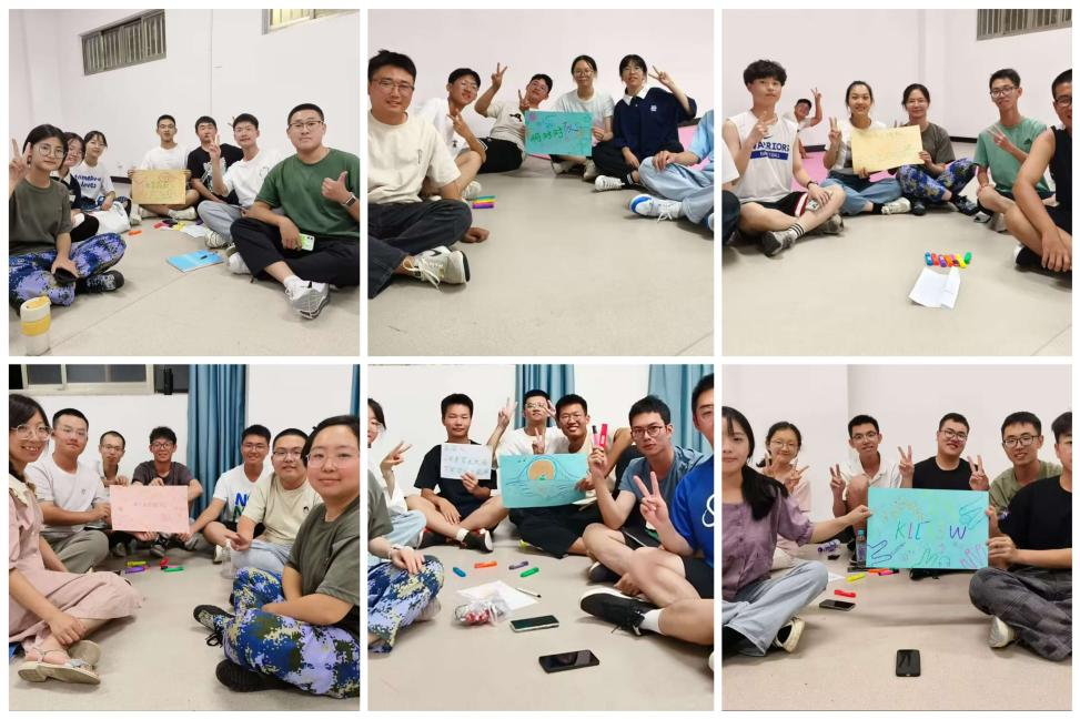 活动伊始,张莹老师通过报数的形式将同学们随机分为6个小组。团体辅导活动分为破冰和情感联结两个环节。新生通过表达性艺术介绍开启破冰启航,通过肢体语言拉近彼此之间的距离;通过连环介绍彼此熟识,增强团体凝聚力。在表达性艺术介绍与连环介绍环节中,同学们意气风发,充分发挥了自己的想象力与表达能力,展示出新时代青年的靓丽风貌,彼此之间的隔阂渐渐消磨,为后续制定团体契约的活动打下了坚实基础。在制定团体契约的过程中,队伍内的成员不断以鲜活思维碰撞出火花,共同完成了“确定组名、口号、契约”的任务以及海报的设计。