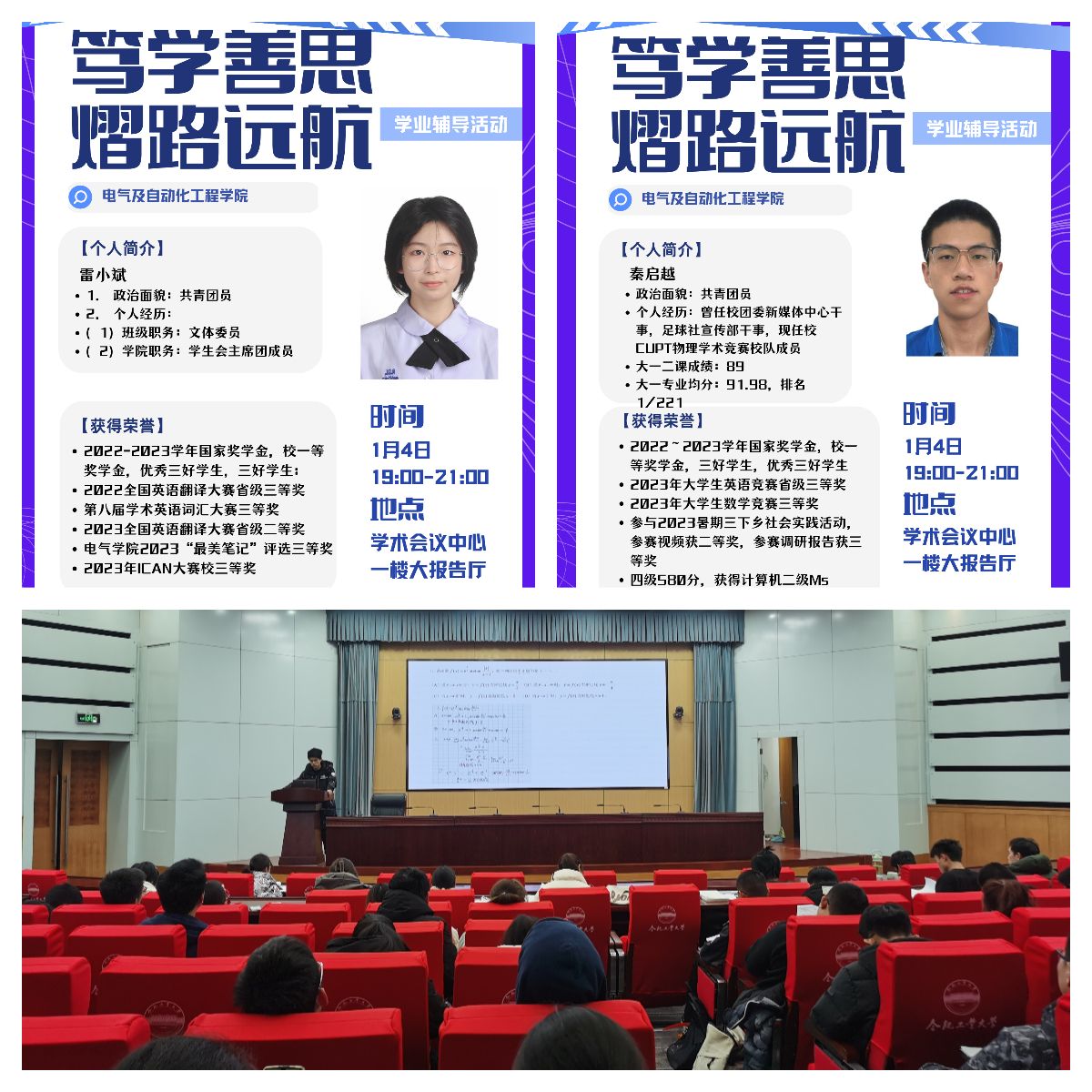 12月27日至1月10日,beat365在线唯一官网开展“‘熠’路远航,笃学善思”学业辅导系列活动,活动分为“骨干教师引航,明晰专业方向”“朋辈榜样助航,分析重点难点”“学习互助导航,增强发展动能”三部分内容,打造“骨干教师-朋辈榜样-学生互助”三位一体的学业帮扶体系,帮助学生明晰发展方向,掌握学习方法,增添学习动能,助力成长成才,学院750余名学生参加活动。