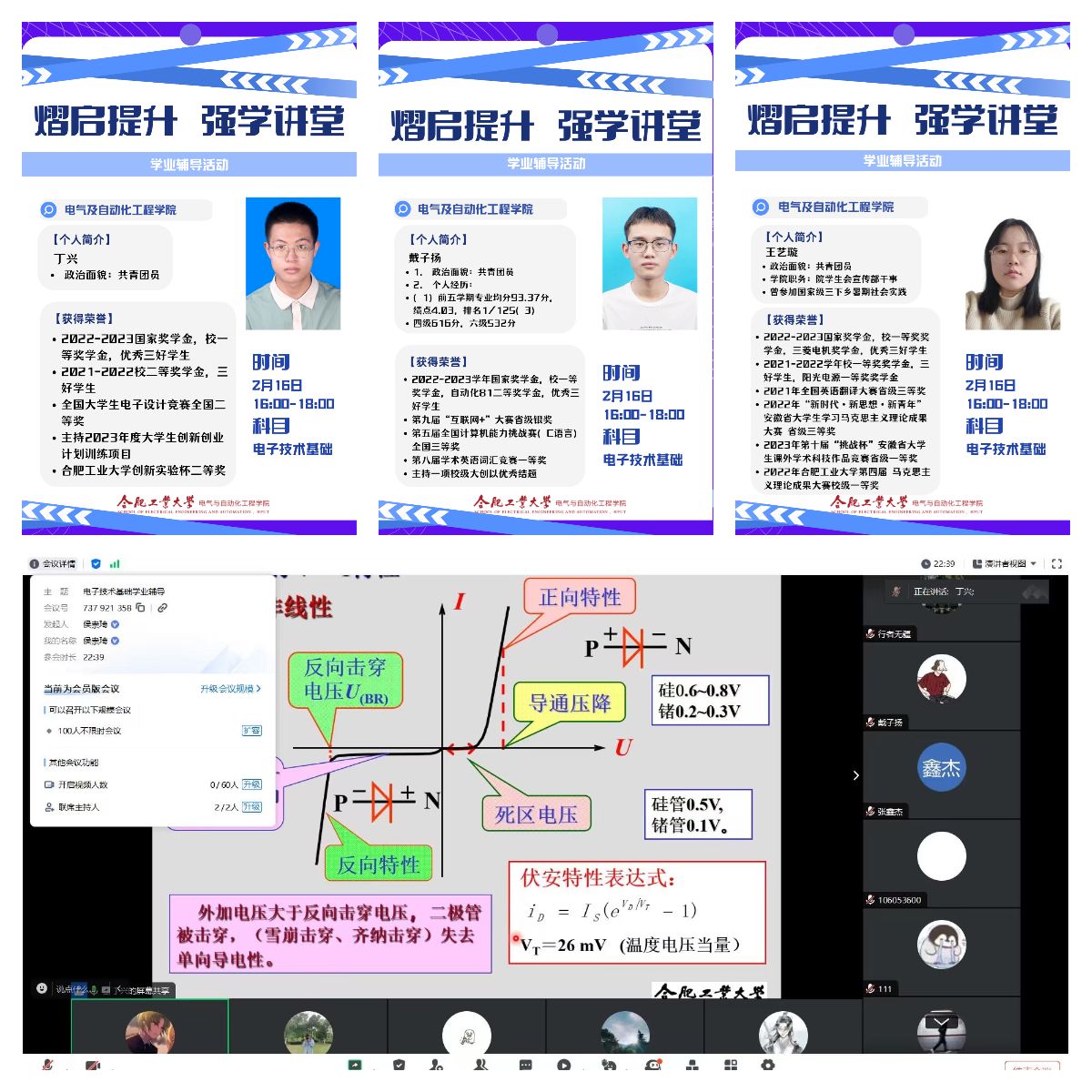 2月16日至2月18日,beat365在线唯一官网开展“‘熠’启提升,强学讲堂”线上学业辅导活动,学院建立“骨干教师+朋辈讲师”学业导师队伍,各年级调研摸排学生需求,针对《电力电子技术》,《电子技术基础》,《线性代数》,《工程图学》等课程开展学业辅导,帮助学生掌握学习方法,把握重点难点,增添学习动能,树立学业信心,顺利通过考试,学院150余名学生参加活动。