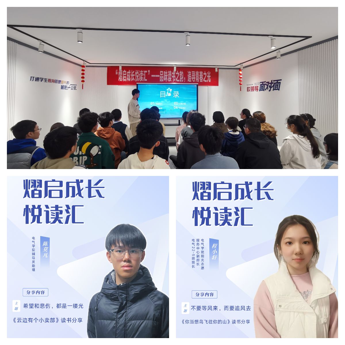 陈莫凡同学以“希望和悲伤,都是一缕光”为题,分享了《云边有个小卖部》的读书心得。他从爱情、亲情、梦想三方面分享了自己的感悟,关于爱情,年少的欢喜炽热又真诚,故事的开头适逢其会、猝不及防,故事的结局花开两朵、天各一方,相爱的两个人不一定有结局,但一定会有意义。关于亲情,总会有那么一个人灿若繁星,照亮迷茫未来;总会有那么一个人用心守望,全情呵护成长。关于梦想,追逐本身就是一场华美的旅途,每一个都是跋涉的旅人,那些即将到达的星辰大海,都是沿途最美丽的风景。他的分享让同学们珍惜每一个不期而遇的惊喜,呵护每一份真挚赤诚的热爱,追逐每一抹青春梦想的色彩。程小轩同学以“不要等风来,而要追风去“为题,分享了《你当像鸟飞往你的山》的读书心得。塔拉是一个17岁前从未踏入教室的大山女孩,却凭借拼搏和努力让人生熠熠生辉。她的童年没有读书声,只有起重机的轰鸣和废铜烂铁的垃圾场。她逃离大山,打开另一个世界,教育给了她新的世界,带来了无限可能。同学们痛心于主人公悲惨的童年经历,却更加震撼于她的顽强与成就、坚韧与勇敢,激励大学生珍惜教育机会,拓展视野阅历,汲取知识养料,顽强拼搏进取,追梦精彩人生。机器人23-2班佘文浩谈到;“通过读书分享会,与志同道合的同学们畅游书海,分享读书的收获和喜悦,这种连接与共鸣、收获与成长将是我青春岁月中一段宝贵的经历 ”。