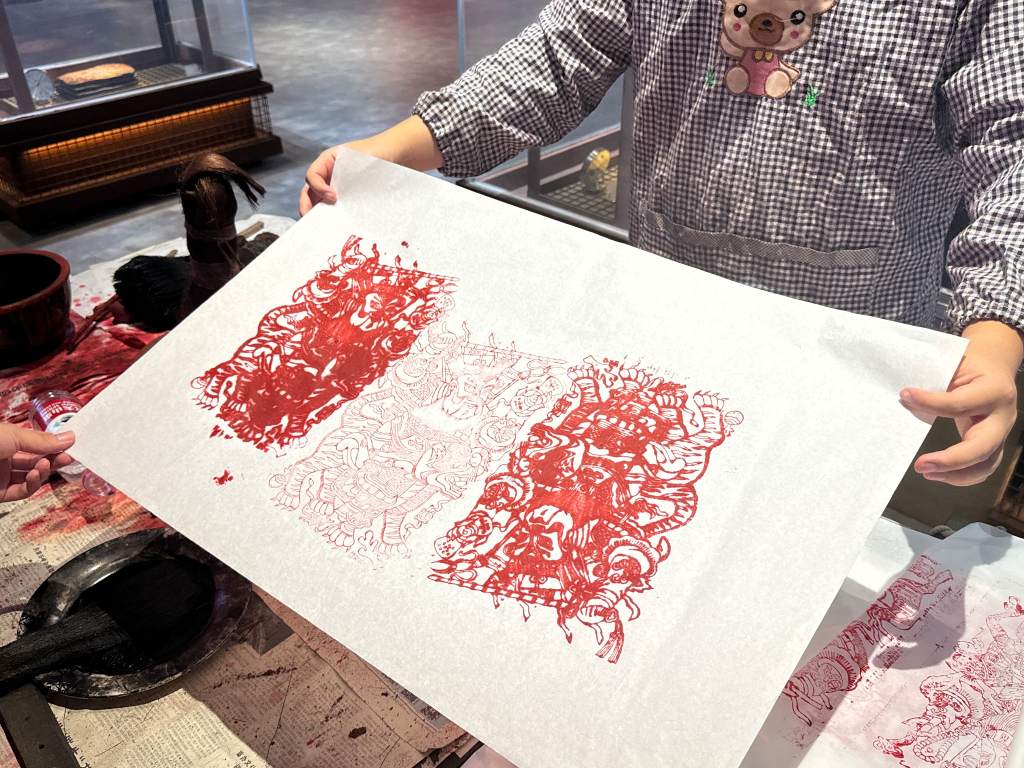 亲历得以明匠心。山东自生堂年画博物馆中,在相关负责人的带领下,团队一行参观了财神像、童子像、动物像等木版年画原板,更加深入地接触了古人以石为地、以刀代笔勾勒出的“艺术画卷”,了解到了年画背后持续演变的生活习俗与思想动向。过程中,团队成员亲历木版年画雕刻全过程,在一刀、一振、一刷、一按的体验中对话时空,在行云流水、错落有致的瑰宝里体悟匠心,以青年手中的细腻刀法,斧凿出意蕴深远的历史文风,镌刻独有的中国记忆和印韵年华。