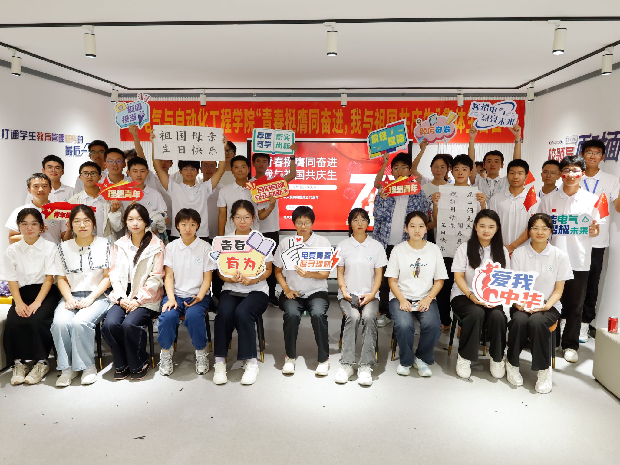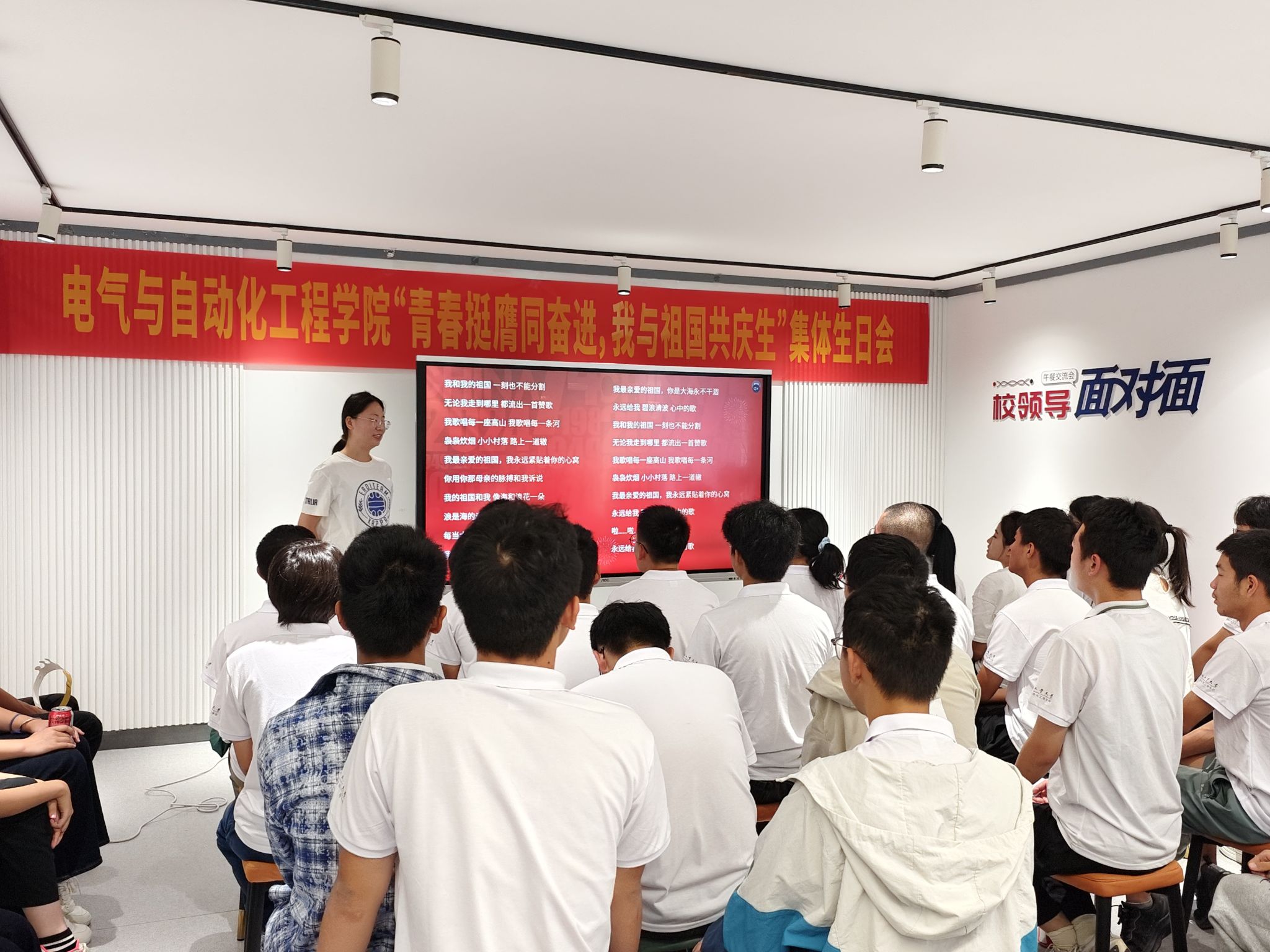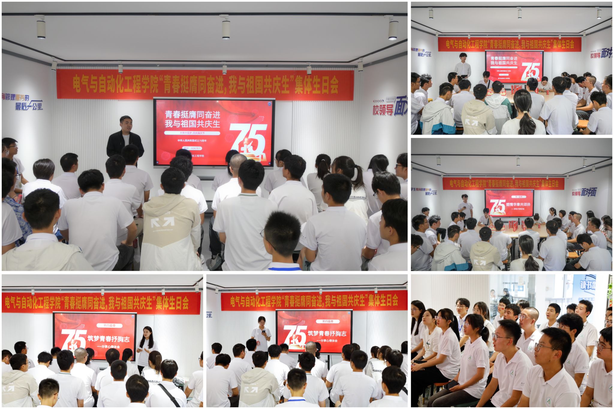 在教师谈理想环节,学院相关负责老师在致辞中谈到,值此国庆节假期、校庆日即将到来之际,大家齐聚一堂一起过集体生日,为祖国祝福、为母校喝彩、为同学庆生,就是让大家感受到国家的繁荣昌盛、学校的蓬勃发展、学院的温暖温馨,铭记峥嵘岁月、扬帆砥砺前行。经过70多年的发展,学院已经成为学校人才培养、科学研究、社会服务的主力军和重要基地之一,一代代工大电气人工业报国,主动服务国家和社会,身为一名电气学子,一是要爱国笃志,永葆家国情怀,二是要澡雪精神,磨炼坚韧心性,三是要求真务实,练就过硬本领,成长为不惧“八面来风”、勇挑“千斤重担”、全面发展的新时代大学生。在学生话成长环节,机器人工程专业2023级2班佘文浩、电气工程及其自动化专业2024级2班陈雨茜、电气工程及其自动化专业2024级3班李文硕、自动化专业2024级2班尹雨涵在发言中谈到,从巍峨的山巅到广袤的草原,从奔腾的江河到浩瀚的大海,祖国用她的每一寸土地孕育了十四亿中国人,身为其中的一分子,也身为一名肩负重任的青年,更要在学习生活中惜时光、勤奋学习、勇挑重担、直面挑战、拒绝躺平,用自己的实际行动,为国家增光添彩,为母校增光添彩!