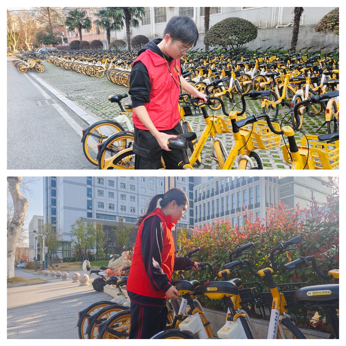 规范停放,共建文明校园,活动聚焦校园内共享单车乱停乱放、车筐遗留杂物等突出问题。学院组织30余名志愿者们分组行动,对西二教学楼、主教学楼及宿舍楼周边停车区域展开全面整理。志愿者们细致清理车筐内的纸屑、塑料袋等垃圾,确保车辆整洁美观。将倒下的单车逐一扶正,避免车身损坏。针对随意停放在道路拐角、绿化带旁的车辆,志愿者们将单车搬运归位,既保障了道路畅通,也消除了安全隐患。积极引导,营造文明风尚,志愿者化身文明倡导员,耐心细致地指导帮助后续到来的师生有序停放。在志愿者的共同努力和师生的积极配合下,停车区域秩序井然,禁停区域无车停放,打造了文明有序的校园景象。通过本次实践,志愿者们深刻体会到,扶起倒地的单车是对公共财产的爱护,清理框内杂物是对校园环境的责任,规范停车秩序是对文明公约的践行。