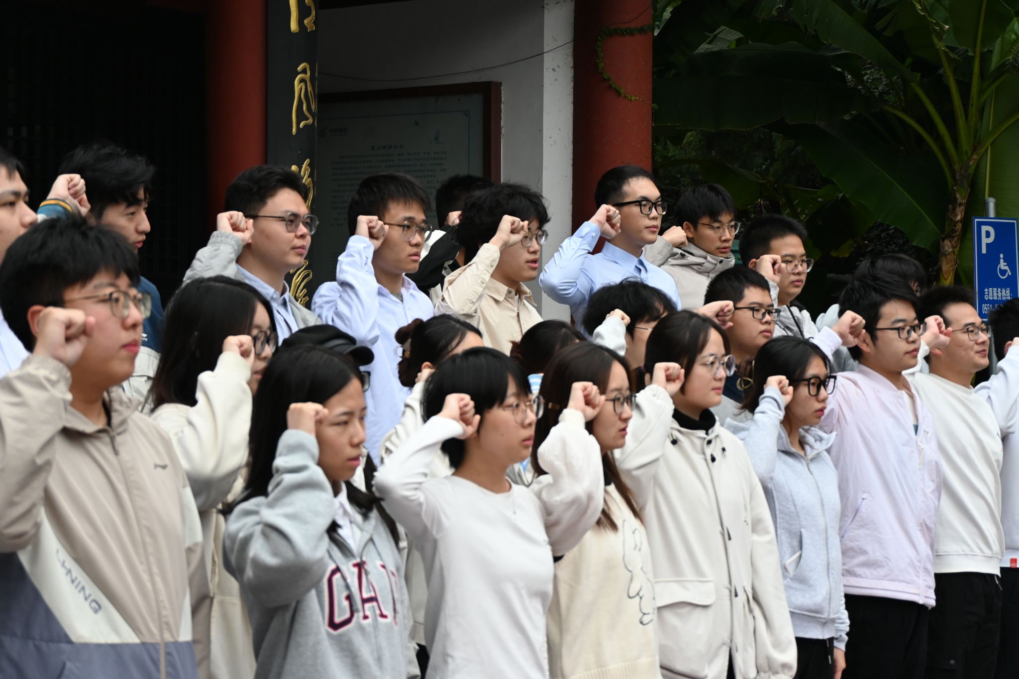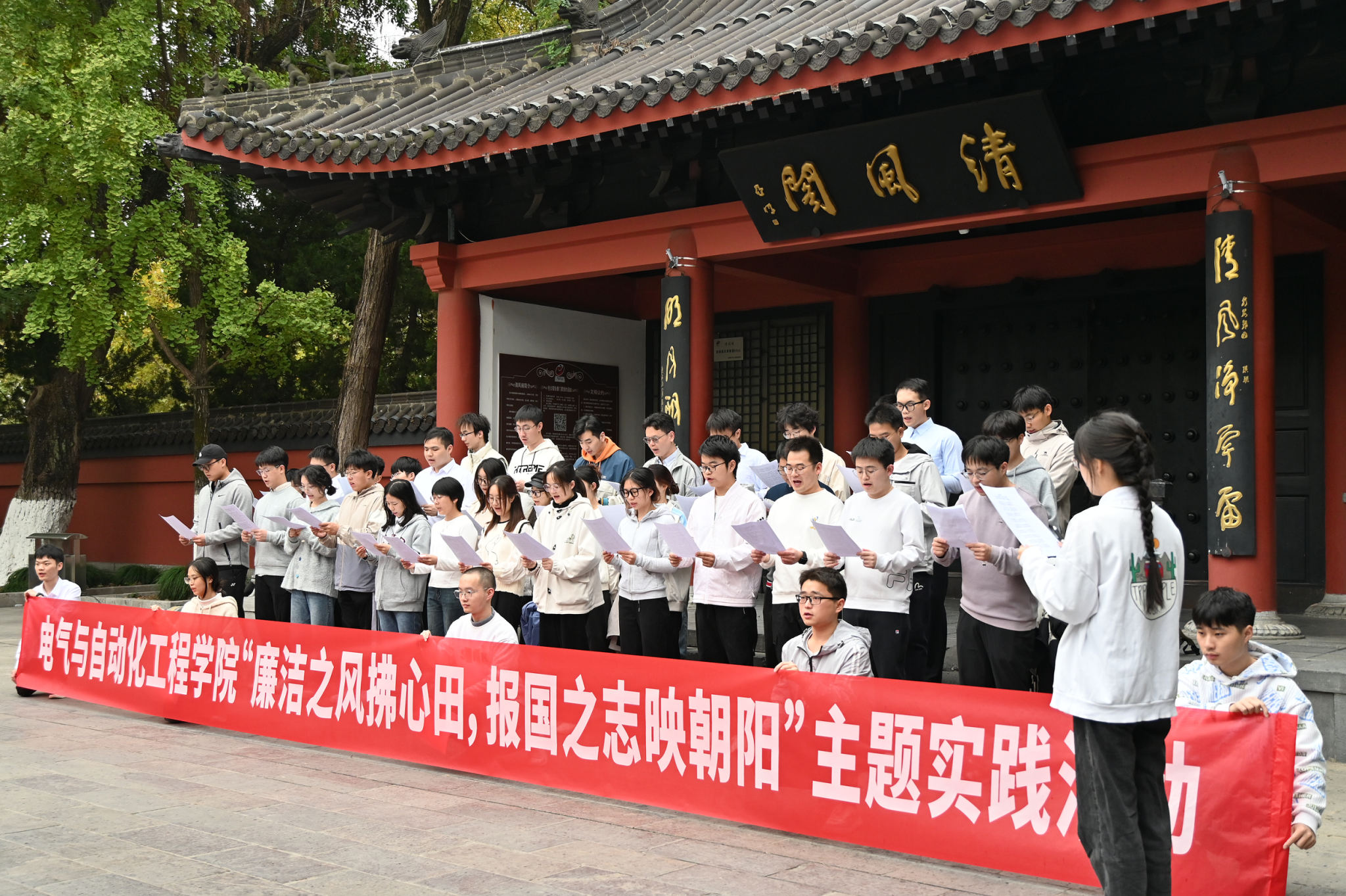 清风阁前,同学们先是共同诵读了《中国共产党纪律处分条例》第八章有关条款,声音洪亮,回荡在清风阁间,彰显出他们坚定廉洁自律的决心。随后同学们齐声诵读诗歌《咏包拯》,表达追求高尚情操和廉洁自律的坚定信念。