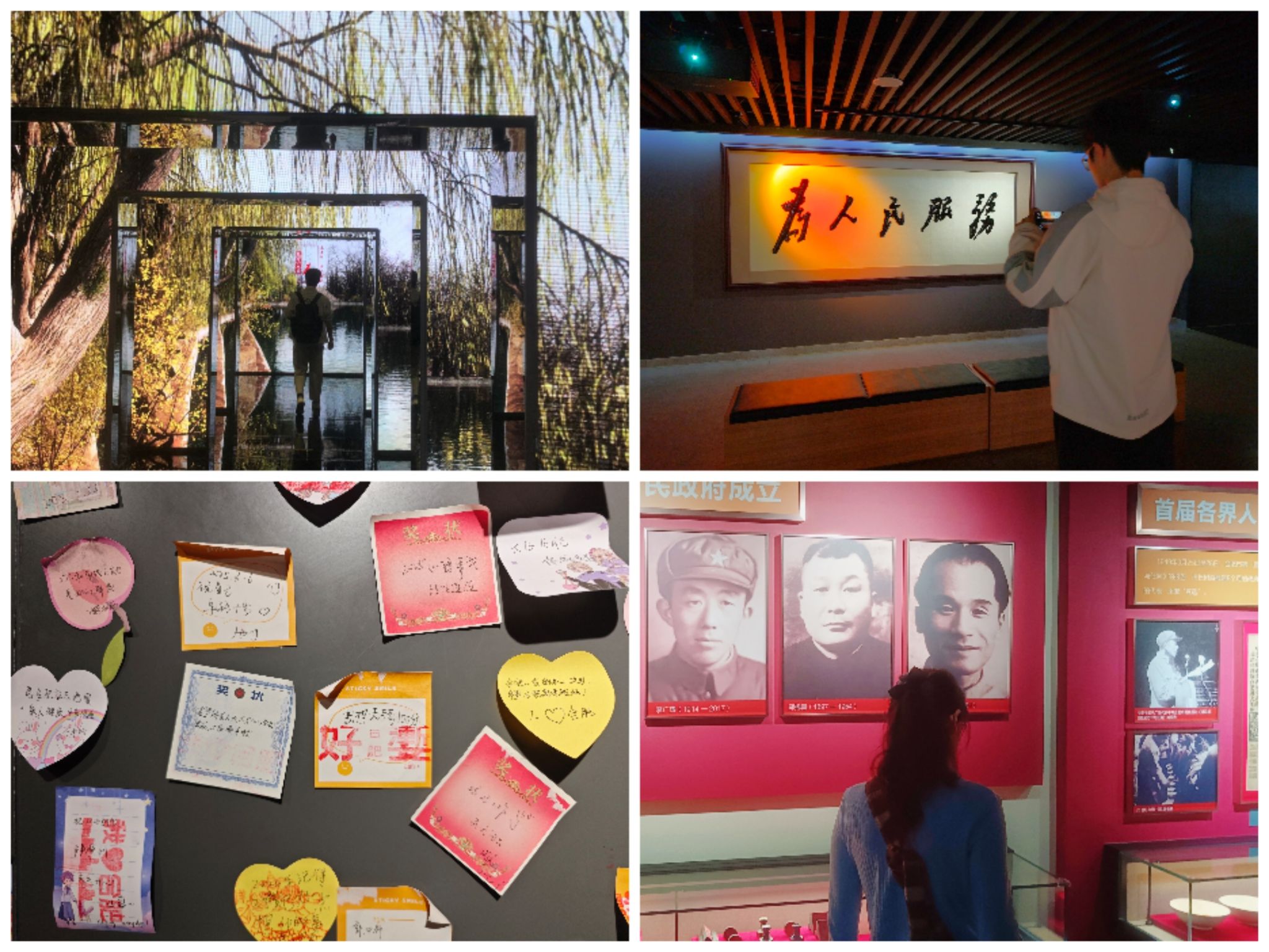 走进展馆,首先映入眼帘的是一幅幅记录合肥变迁的老照片,从五六十年代的农田村落,到八九十年代的三孝口、四牌楼商业街景,再到如今高楼林立的政务区、滨湖新区,影像的对比直观展现了合肥从“小县城”到“大湖名城”的华丽蜕变。最令大家震撼的是“合肥南站”展区的场景还原,大家站在复刻的绿皮火车车厢内,手指轻抚斑驳的木质座椅、老式站台钟、手写车次牌、还有售票窗口的铁栅栏,连空气中都弥漫着煤烟与汗水的味道,仿佛真的穿越回了上世纪80年代的合肥火车站,展馆通过全息投影技术,让蒸汽机车的轰鸣声与站台广播声在耳畔交织,生动复现了改革开放初期的人潮涌动。除了传统展陈,记忆馆还运用现代科技手段,打造了“城市变迁互动地图”,同学们可以通过触摸屏调取合肥任意地点的今昔对比影像,直观感受城市扩张的速度。活动结束后,同学们在一面贴满便利贴的“记忆留言墙”上留下属于自己的感受,并在场馆门口进行拍照留念。