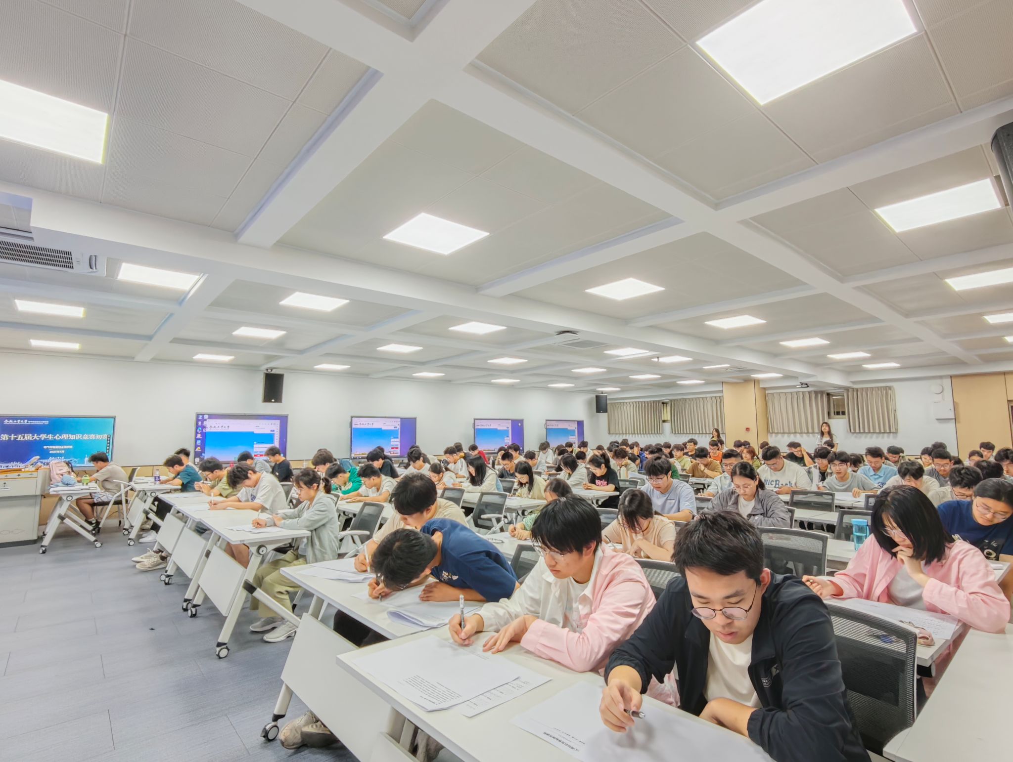 比赛前,学院负责老师指导参赛学生进行认真学习相关知识,竞赛以闭卷考核形式进行,试题涵盖单选题、多选题、判断题、填空题、简答题、案例分析题等多种题型,内容聚焦心理健康知识、心理问题的识别与发现、心理危机干预等多方面知识。参赛学生积极备赛,现场认真作答,展现了扎实的知识储备。