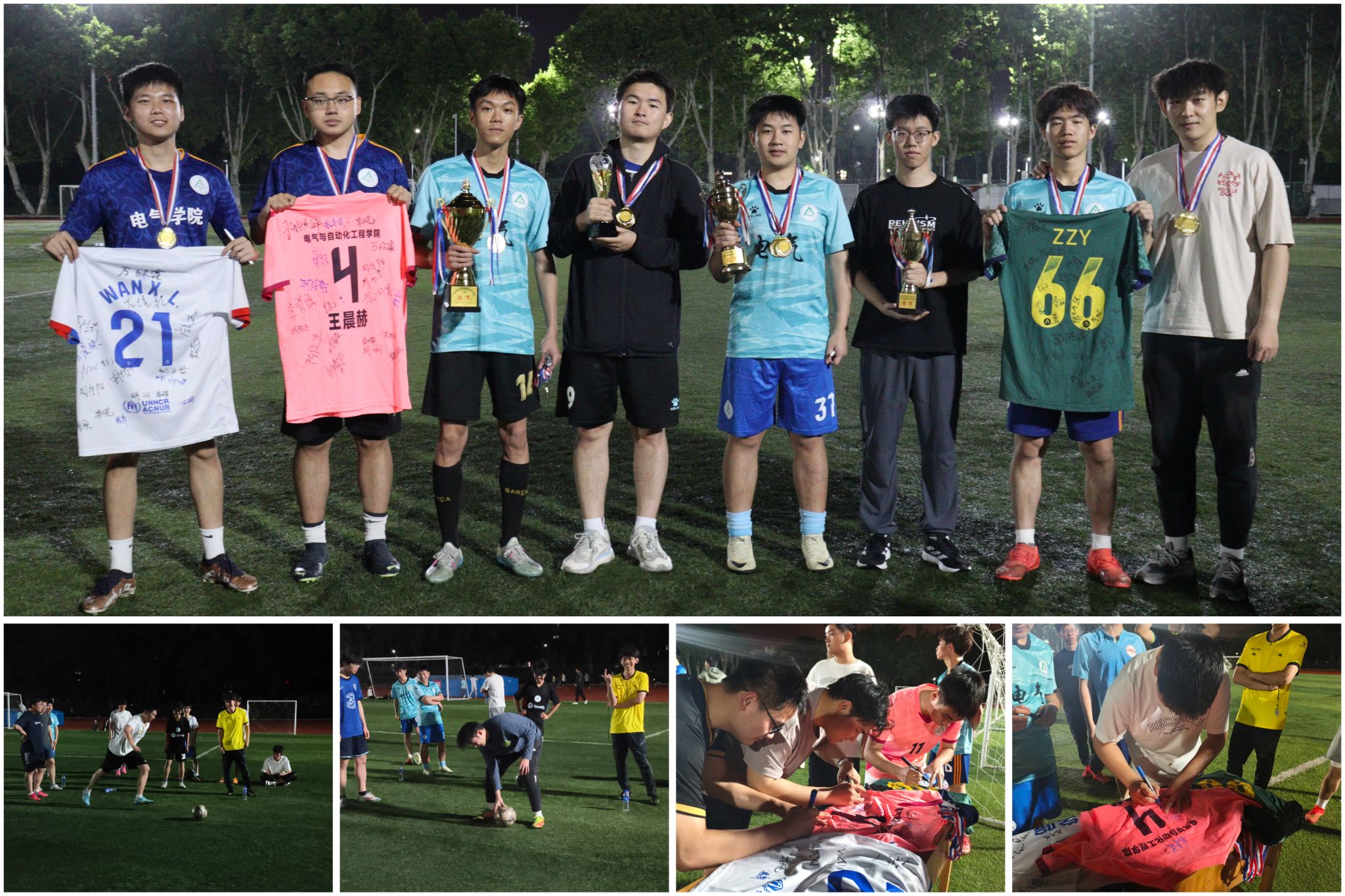 本次比赛采取循环赛赛制,每场比赛之间穿插眩晕足球、蒙眼过人等趣味游戏互动环节。赛场上,全体参赛队员分为毕业生队、在校1队和2队,大家挥洒汗水、凝聚力量、强势进攻、严防死守,为全场观众呈现了一场精彩的比赛,充分展现了电气学子顽强拼搏的体育精神。经过激烈的角逐,毕业生队连胜两场,荣获本届赛事冠军,在校2队荣获本届赛事亚军。在校1队在“眩晕足球”趣味比赛中获得冠军。