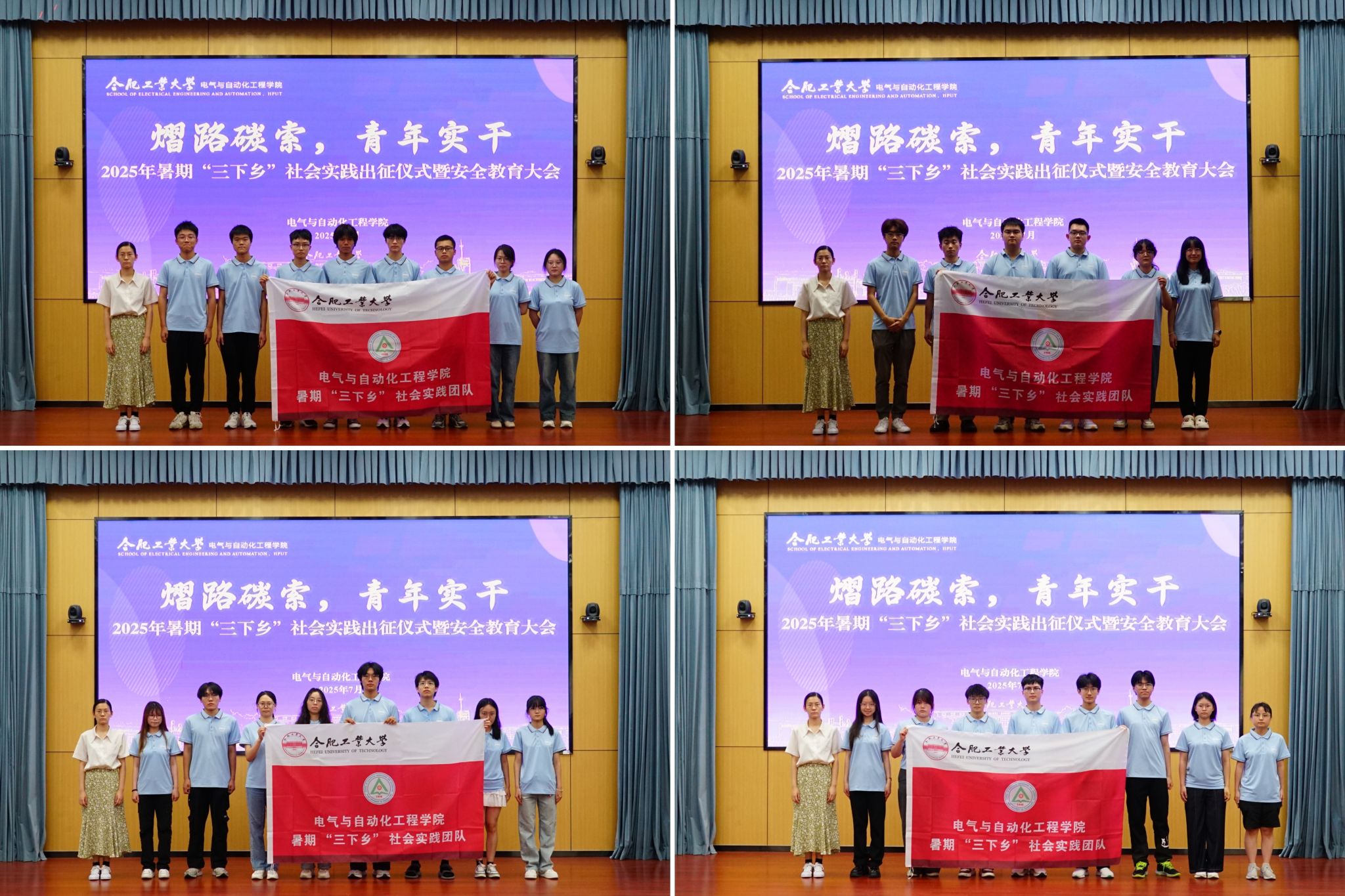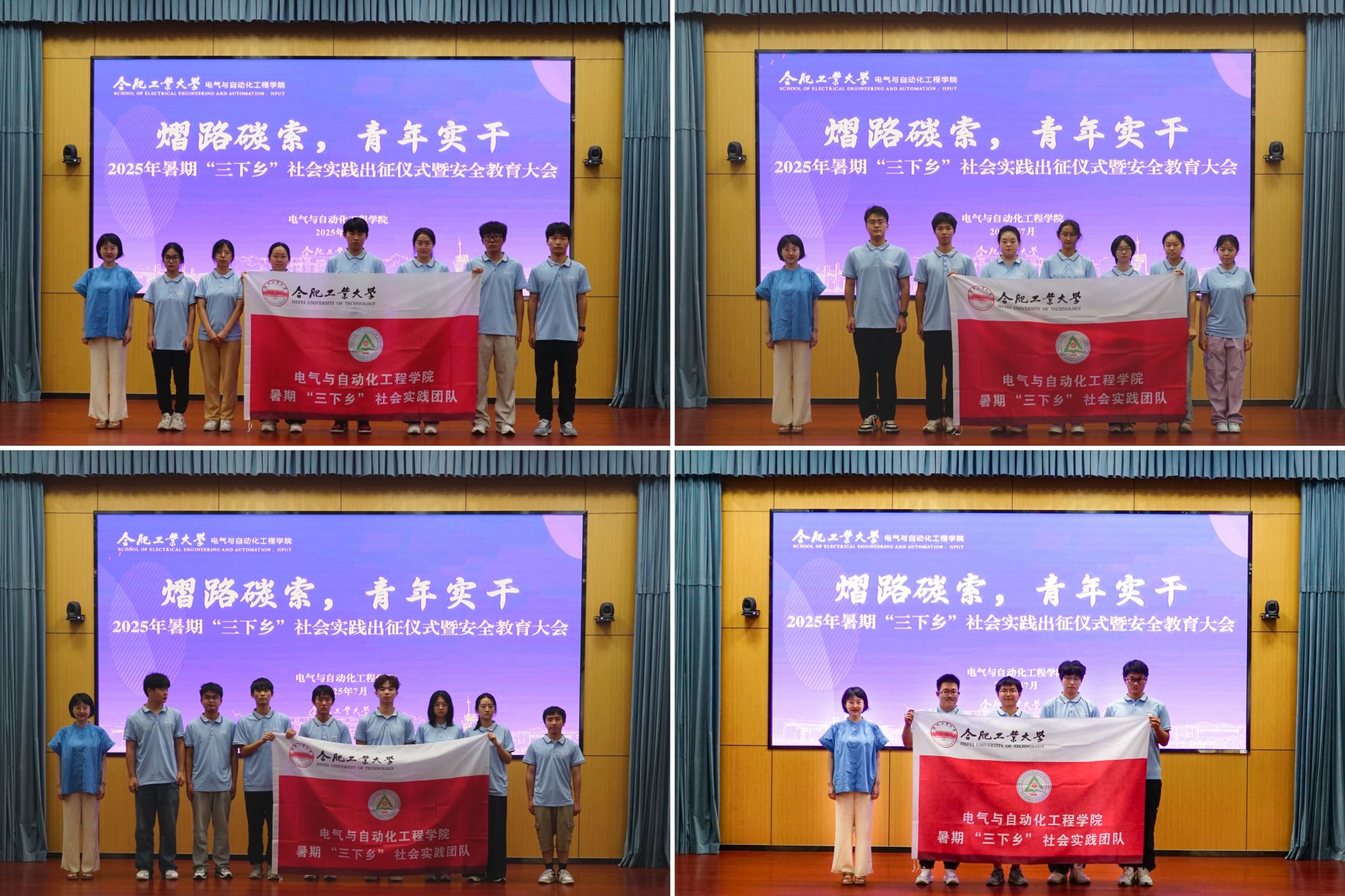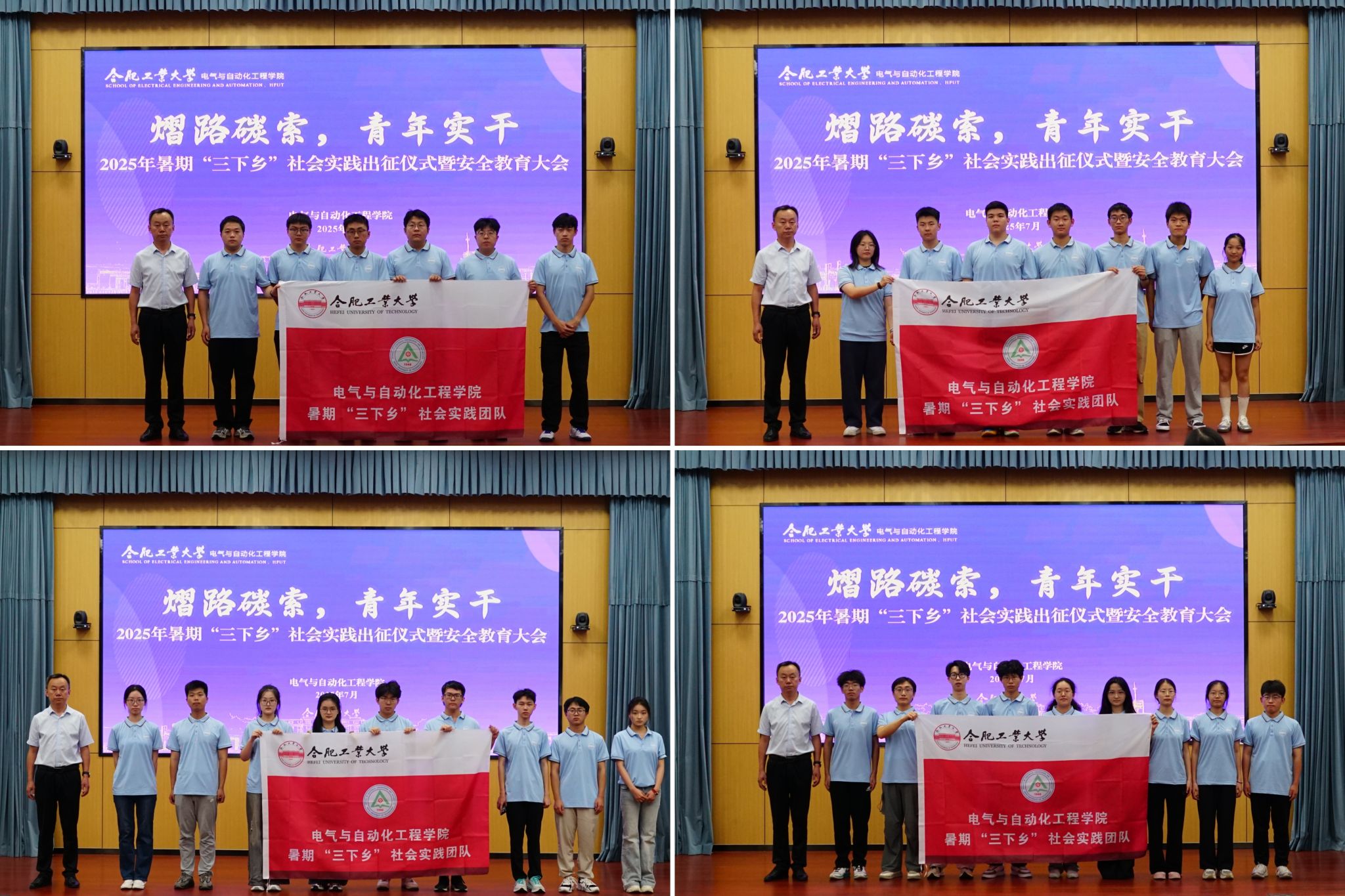 活动在激昂的国歌中拉开帷幕。学院学生工作办公室副主任兼团委副书记左能介绍了学院前期组织申报的基本情况,并希望各团队珍惜实践机会,用脚步丈量大地,用智慧服务社会,用汗水浇灌成长,在社会实践的生动课堂中经风雨、见世面,阔眼界、长本领,收获真知、丰富人生,展现新时代电气青年学子的青春风采。