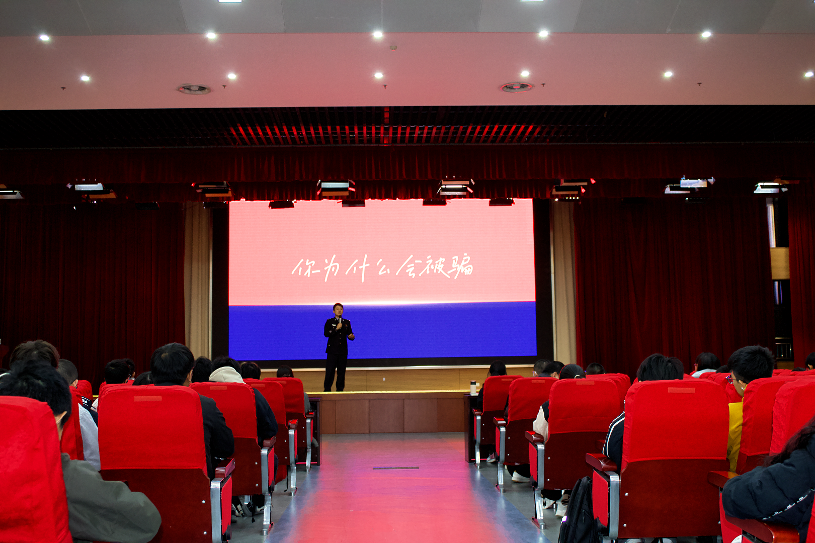 合肥市公安局刑侦支队五大队副队长、国家反诈中心安全学院防骗讲师杨础警官受邀主讲。他结合多年刑侦工作经验,系统深入讲解了电信诈骗的起源演变、作案手段的升级趋势、报警处置的黄金时间等内容,深度剖析了刷单返利、虚假购物、网络游戏虚假交易、冒充客服退款等高校高发诈骗类型,通过还原真实诈骗案例,直观展现电诈套路与隐蔽性。针对大学生群体社会经验不足、防范意识薄弱等特点,他强调“不转账、多核实、快报警”的防范准则,提醒同学们杜绝“贪小利”“存侥幸”心理,时刻筑牢个人财产安全“防火墙”。