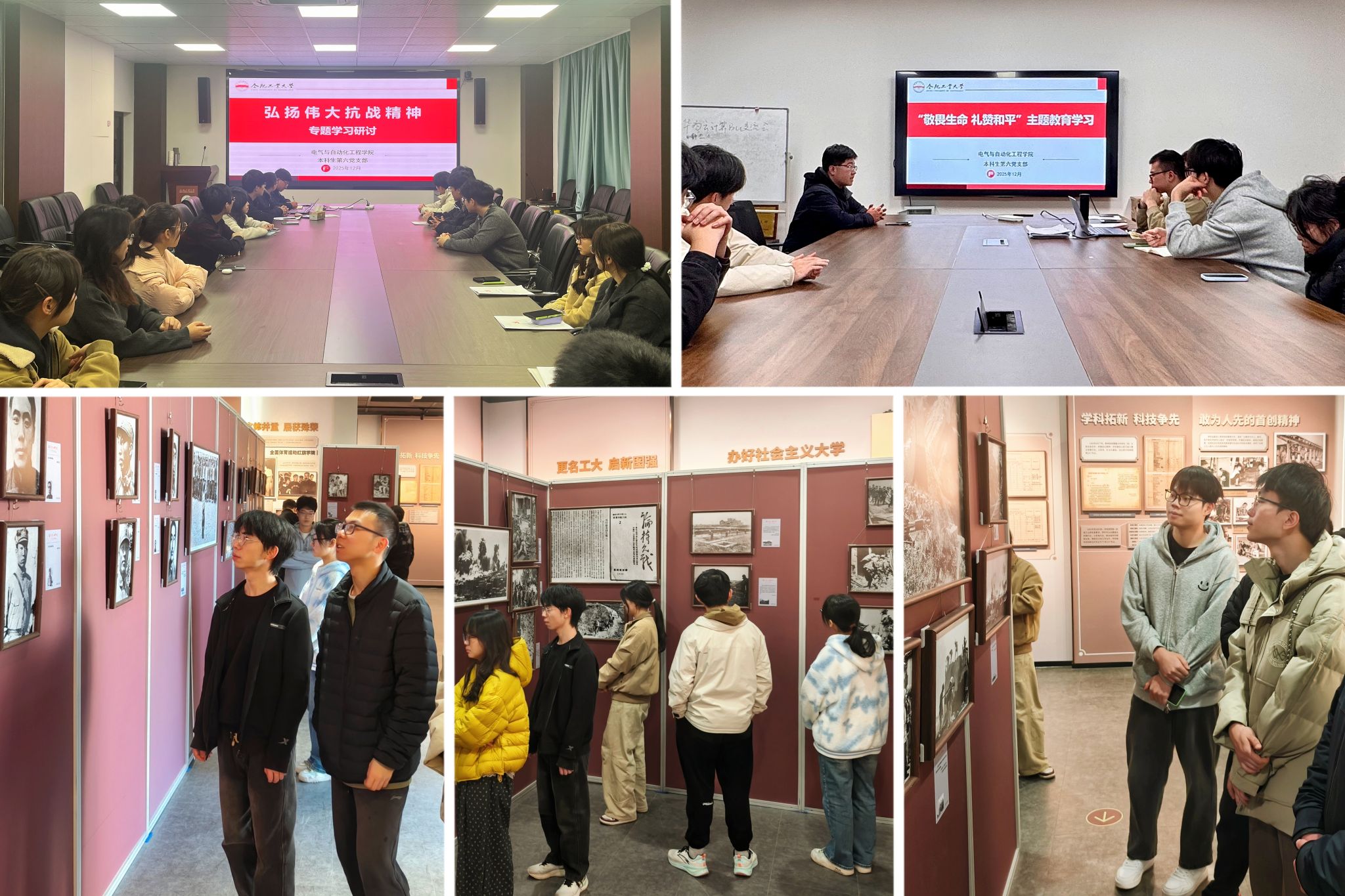 在“国社之镜·世纪光影之人民必胜”艺术展中,师生党员同上一堂“场馆里的思政课”,通过140余幅珍贵历史影像,回望烽火岁月,沉浸式感受中华民族从站起来、富起来到强起来的伟大飞跃,深切体会到中国共产党在全民族抗战中发挥的中流砥柱作用。在“弘扬伟大抗战精神”专题学习中,支部成员就中国共产党人精神谱系展开集中学习,进一步加深对弘扬伟大抗战精神重要意义的理解。在“敬畏生命,礼赞和平”主题研讨中,师生共同观看纪录片,在交流感悟间铭记历史、缅怀先烈,表达对和平的歌颂。