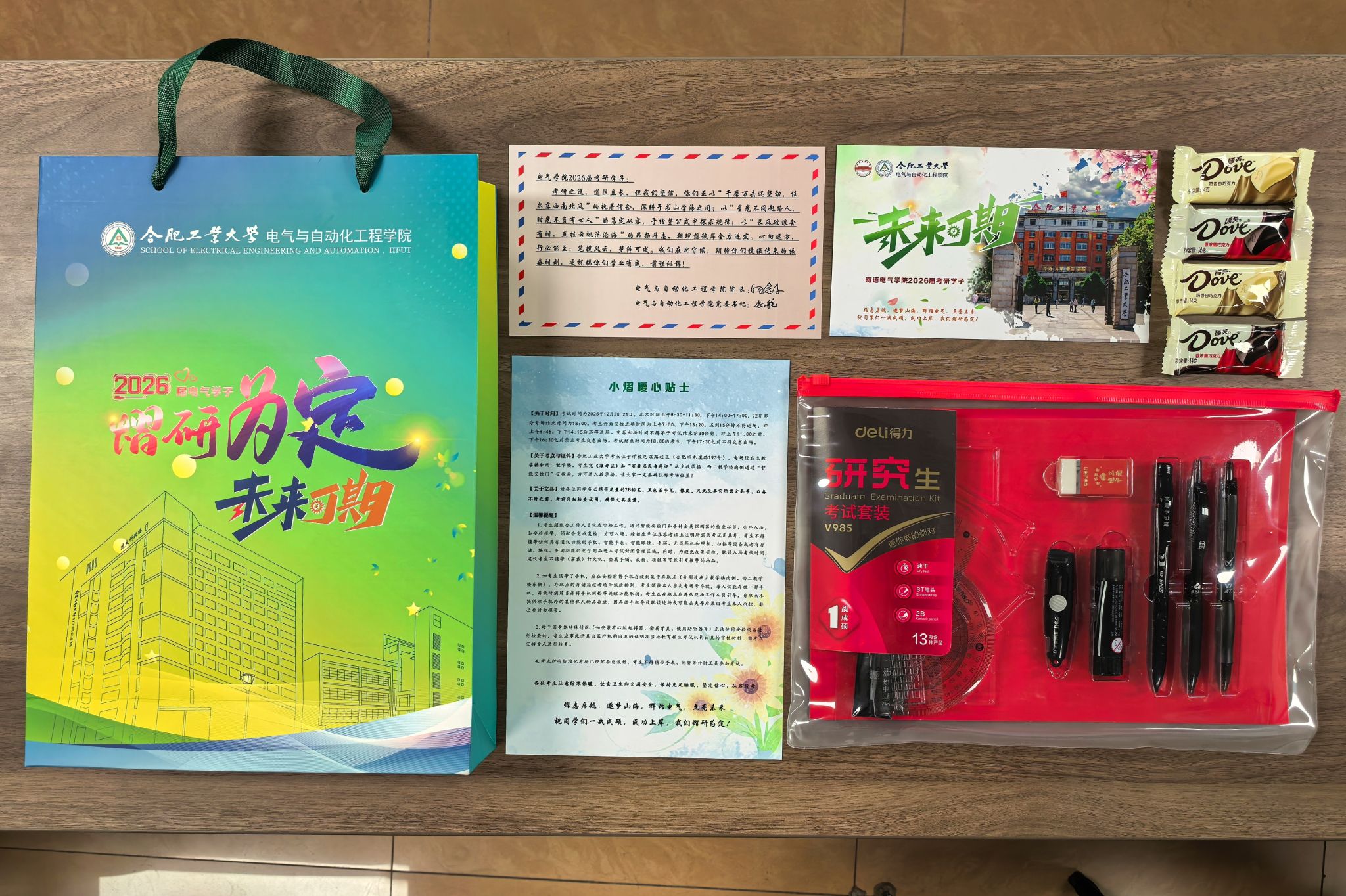 学院为二百余名考研学子精心准备了包含定制手提袋、笔试文具套装、明信片、巧克力、温馨贴士卡的暖心礼包。学院党委书记冯航、院长向念文撰写祝福寄语,通过真挚文字表达对莘莘学子的关心鼓励。学生党员、班级骨干、就业助理等朋辈团队,高效协同完成物资整理与分装工作。学院党委副书记兼纪委书记张栋前往学生宿舍发放礼包,并就报考意向、近期状态等话题同考研学子亲切交流,相关同学表示将以最佳状态自信迎考,不辜负学校与学院的培养与关怀。毕业班辅导员前往主教学楼、图书馆、寝室等场域派发礼包并开展考风考纪教育,提醒全体考研同学以诚信为笔,以实力为墨,共同守护公平公正的考试环境,书写无愧于青春的答卷。