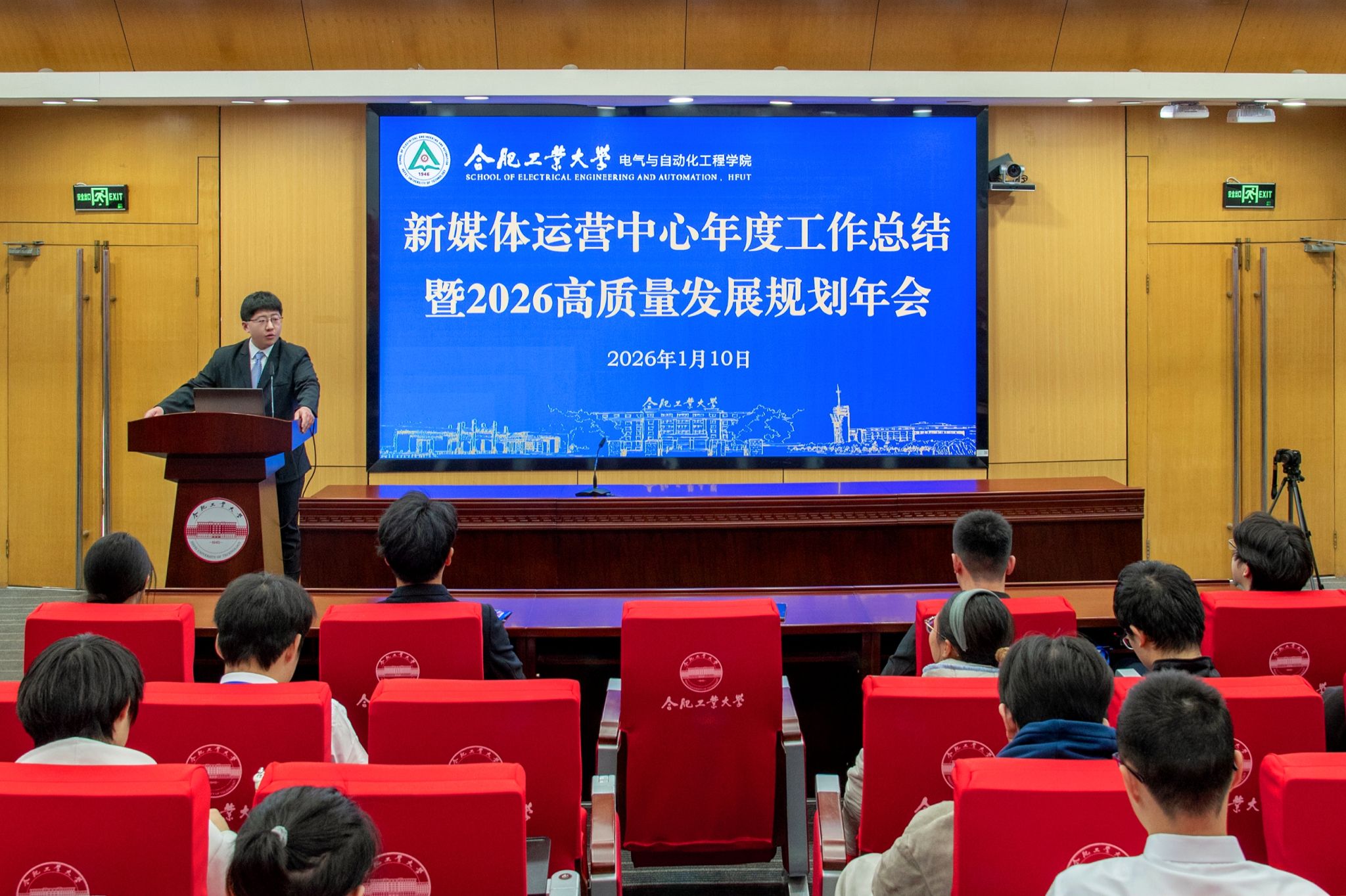 各述其职,回首总结。与会人员现场观看了年度总结视频《电气媒体人的2025》,新媒体运营中心主任翟相博针对任职以来所开展的工作进行梳理汇报,综合办公部、影音宣传部、媒体运营部、信息采集部、平面设计部负责人与新进骨干围绕部门职责、履职情况、工作成绩与不足,依次进行了述职发言。