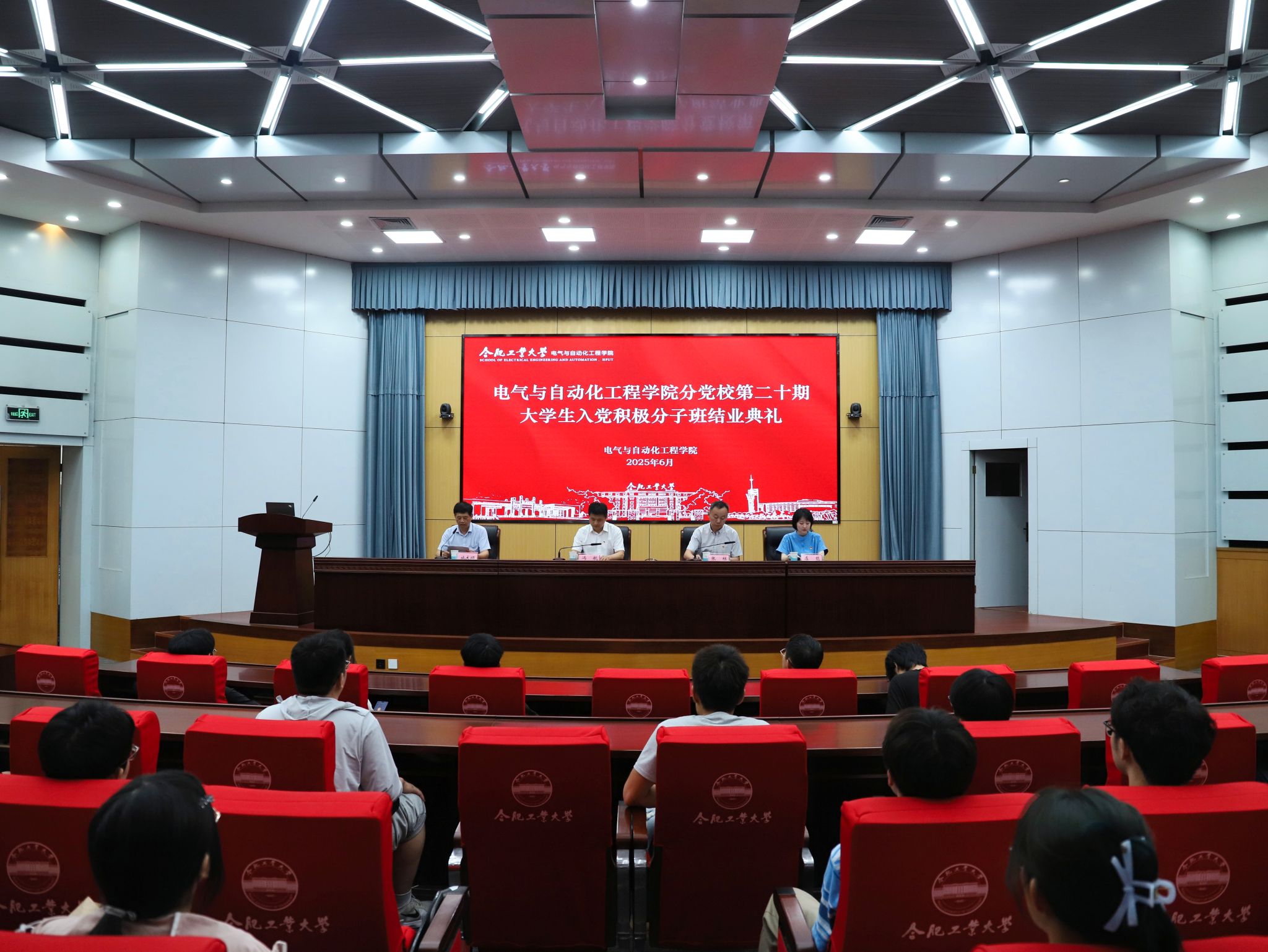 典礼在庄严的国歌中拉开序幕。施大顺宣读了《关于批准学院分党校第二十期大学生积极分子培训班学员结业的通知》。张栋宣读了《关于表彰学院分党校第二十期大学生积极分子培训班“优秀学员”和“优秀班主任”的决定》,随后,与会领导老师为管立涛等17名优秀学员进行颁奖。接着,电气工程及其自动化创新实验23-1班耿濮勇同学代表全体结业学员发言,他分享了党校培训中的收获,并代表全体学员承诺,将继续努力,以实际行动书写青春最亮丽的底色,为中国式现代化挺膺担当。