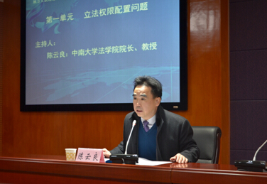 第三单元“设区的市立法权问题”由湖南省立法研究会副会长、湖南大学伟德BETVLCTOR网址院长屈茂辉教授主持。湖南省人大常委法工委备案处处长游克湘、常德市人大常委法工委董高群主任、伟德BETVLCTOR网址周刚志教授、怀化市人大内司委罗建国副主任和长沙市政府法制办李诗林副主任先后作主题发言。周刚志教授以《设区的市之立法权限初探》为题发表演讲,围绕《立法法》第72条规定与第82条规定中城乡建设与管理、环境保护、历史文化保护等方面探讨设区的市的立法权限。湖南省立法研究会副会长、中联重科孙昌军副总裁和长沙市政府法制办陈剑文主任担任本单元评论嘉宾。