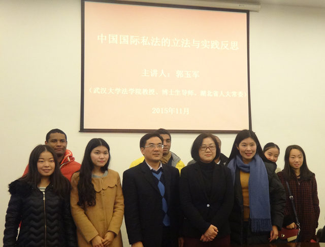 2015年11月28日武汉大学郭玉军教授应邀来我们开展主题为“中国国际私法的立法与实践反思”的讲座。讲座由我们刘益灯教授主持,我们部分研究生与本科生参加。